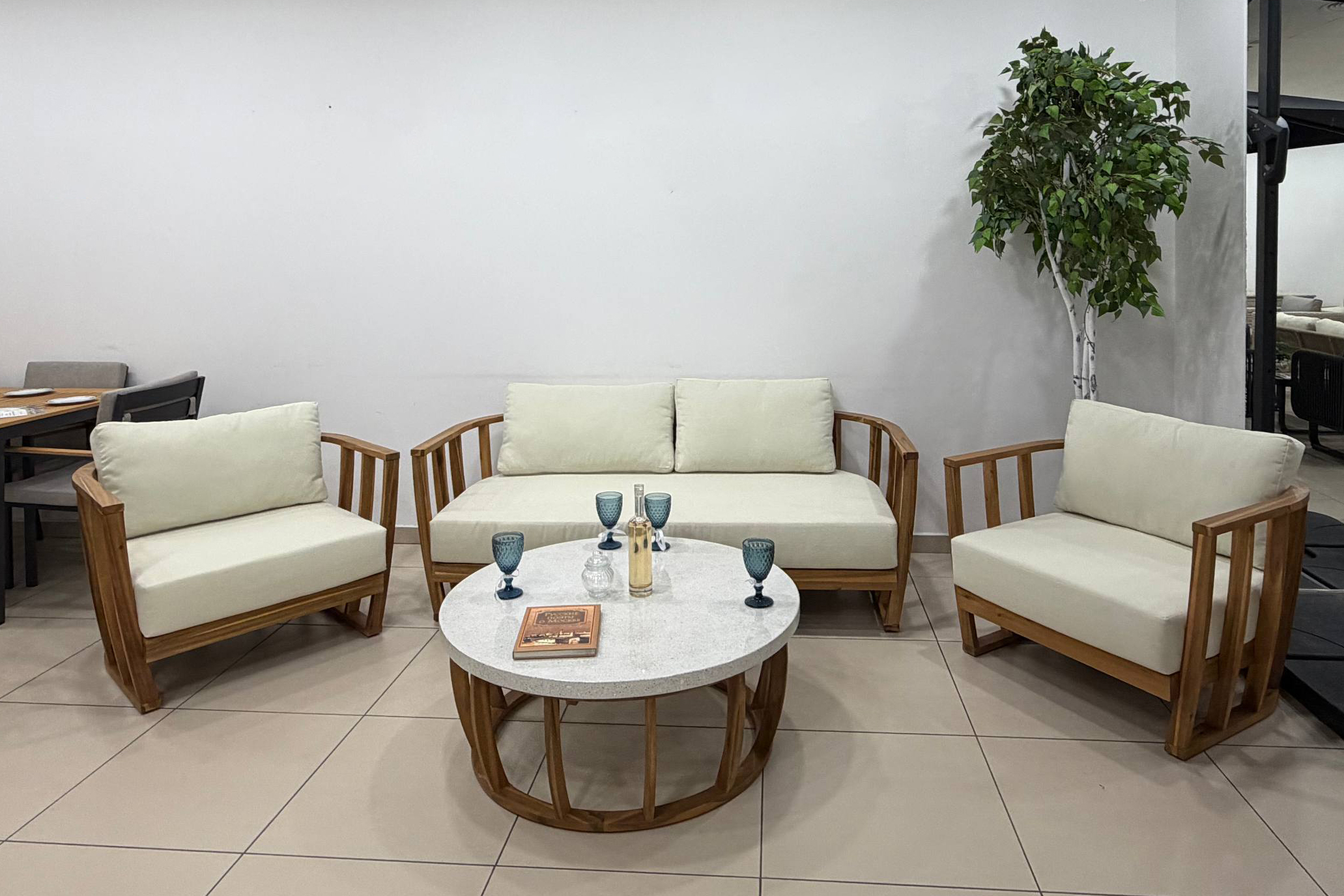 Лаунж-зона Эллиот готова к любым капризам погоды, сохраняя безупречный вид — будь то знойное лето, прохладная осень или морозная зима. Универсальная эстетика с теплым тоном натуральной акации и нежным бежевым оттенком подушек гармонично впишется в любой ландшафтный дизайн, от классики до современности.