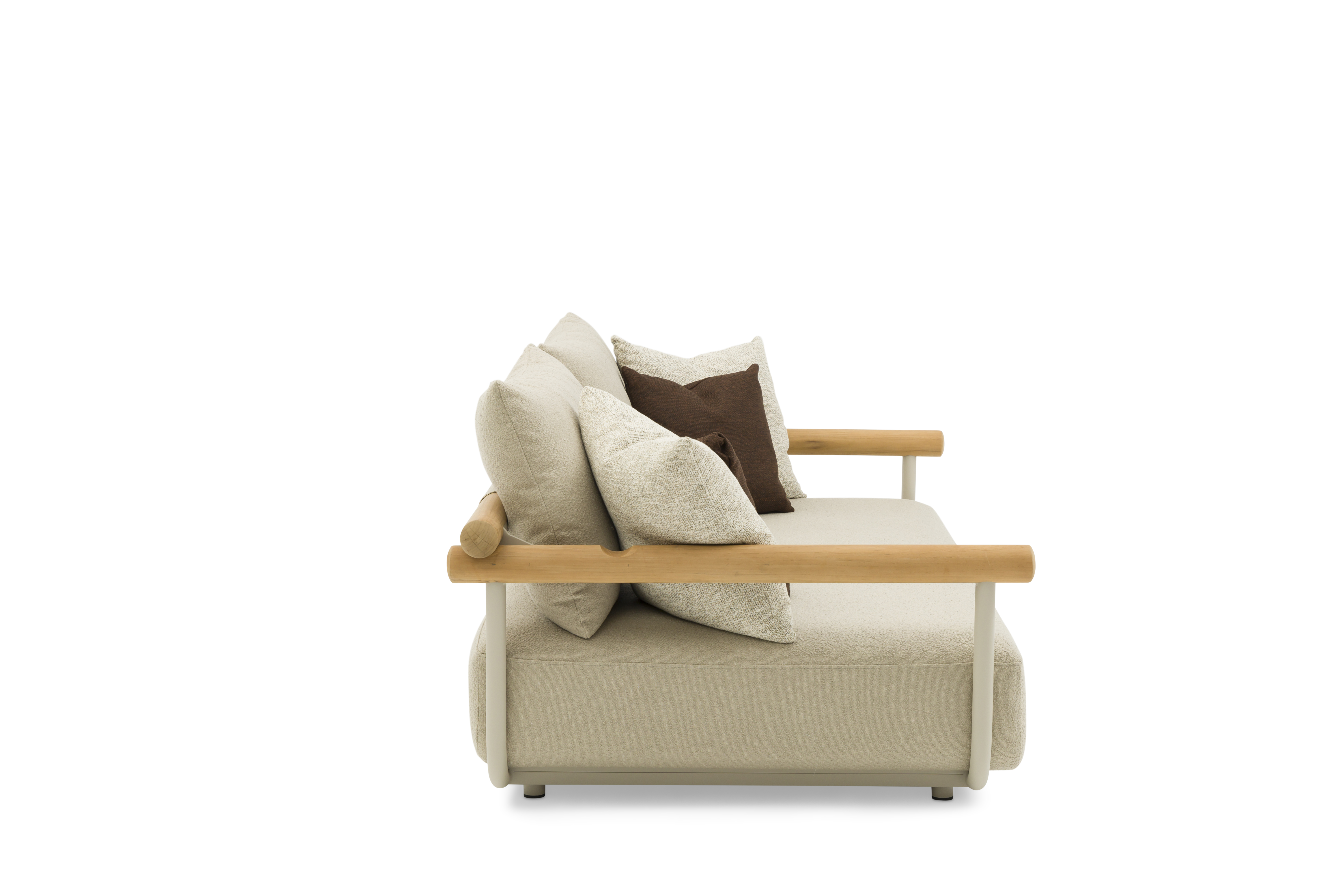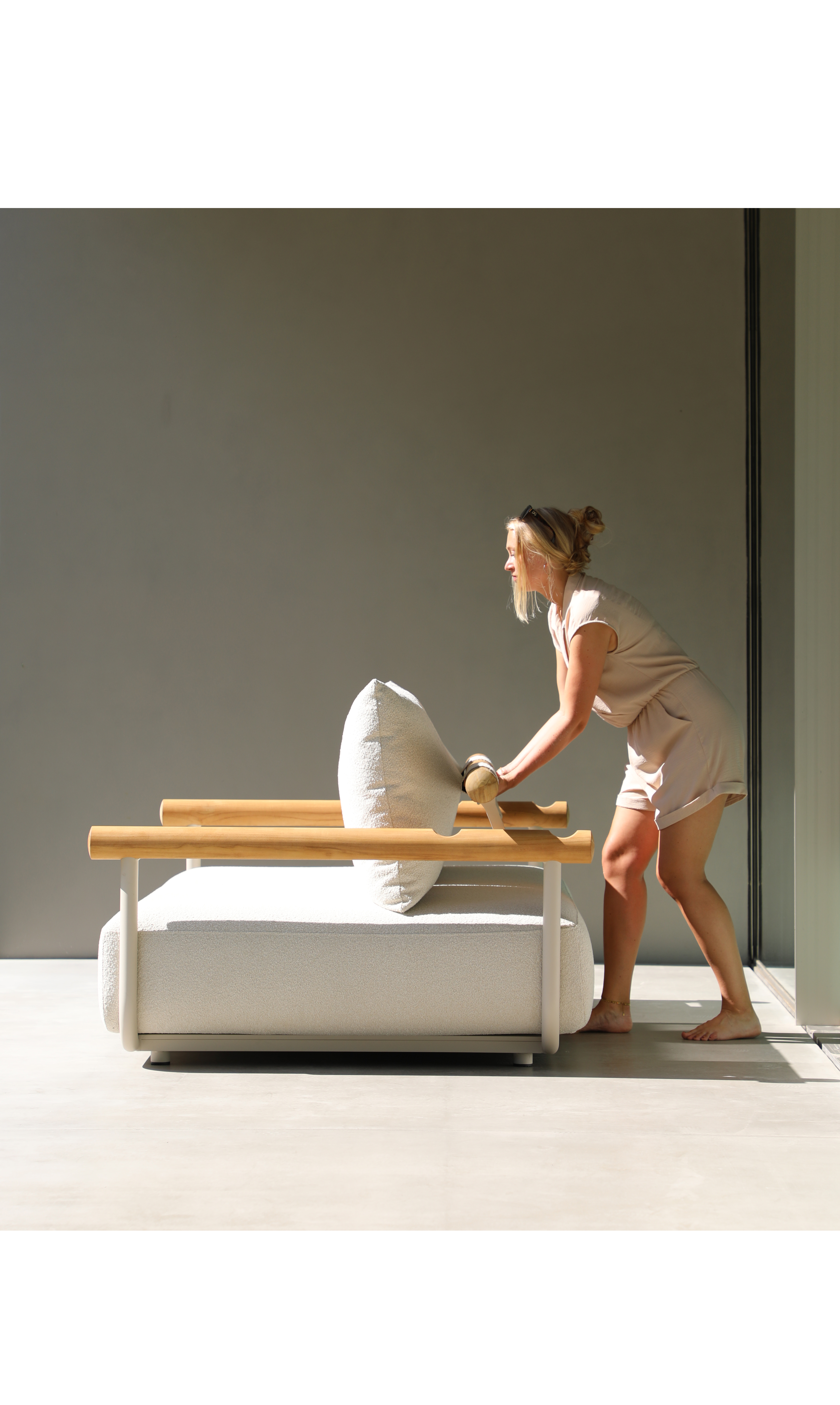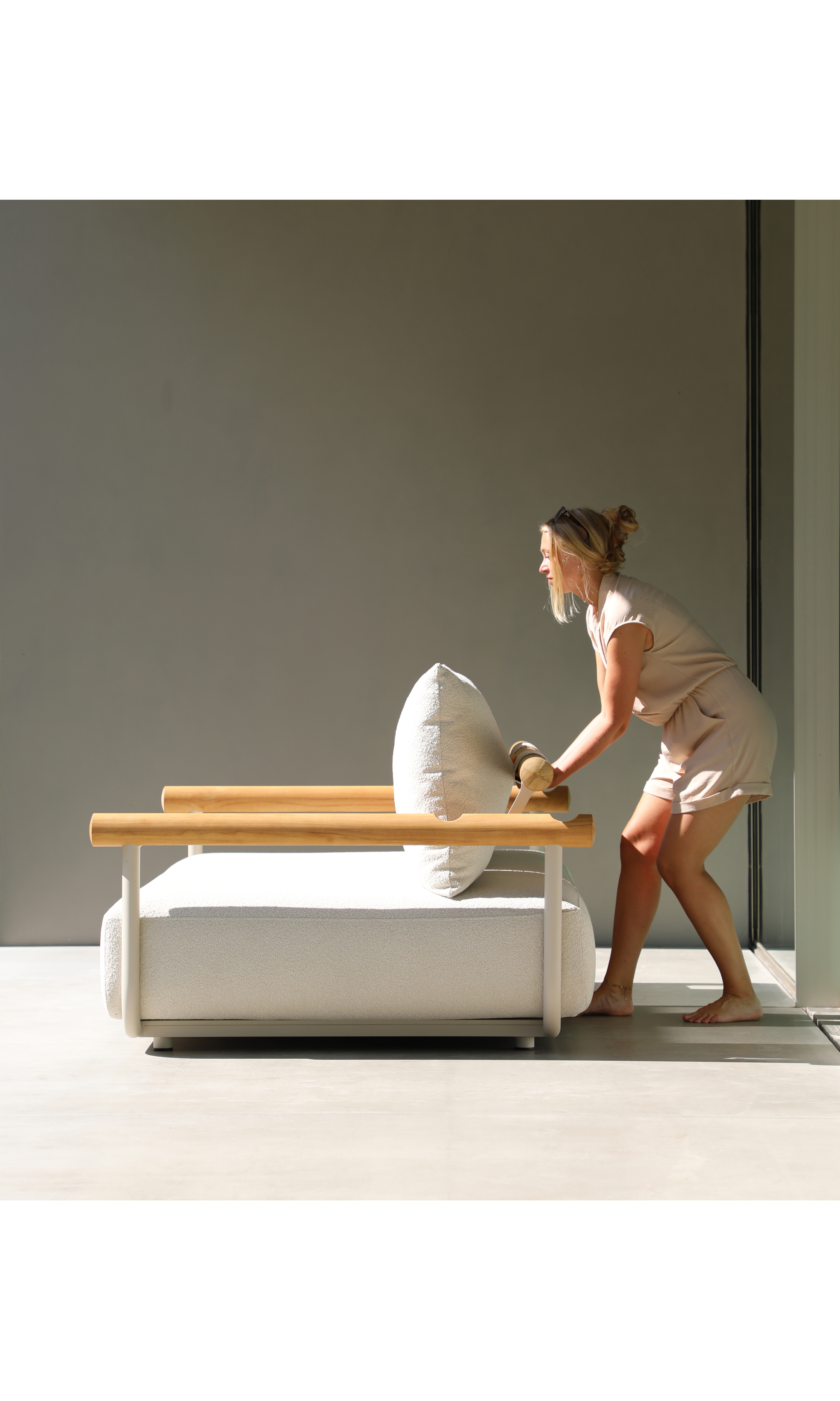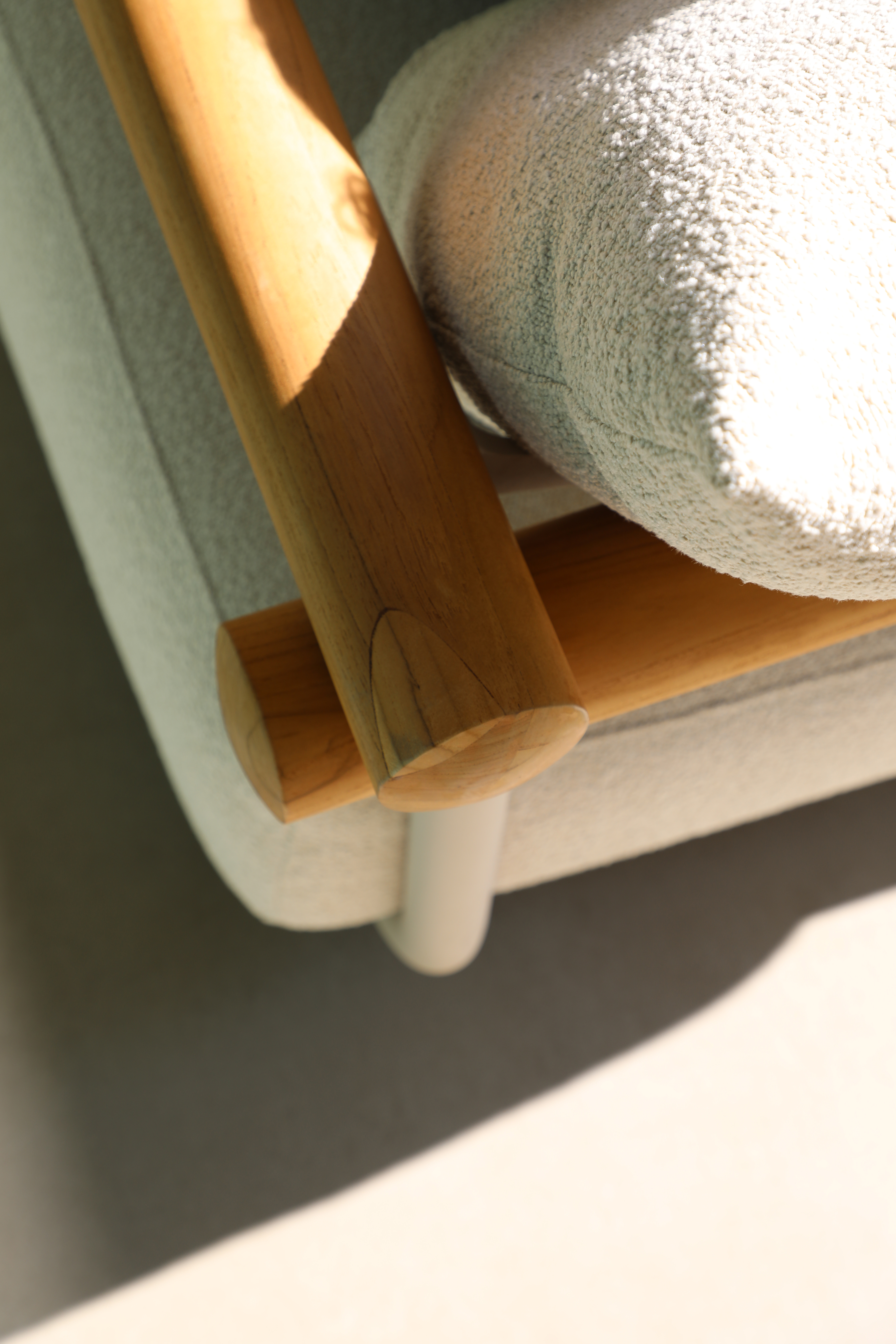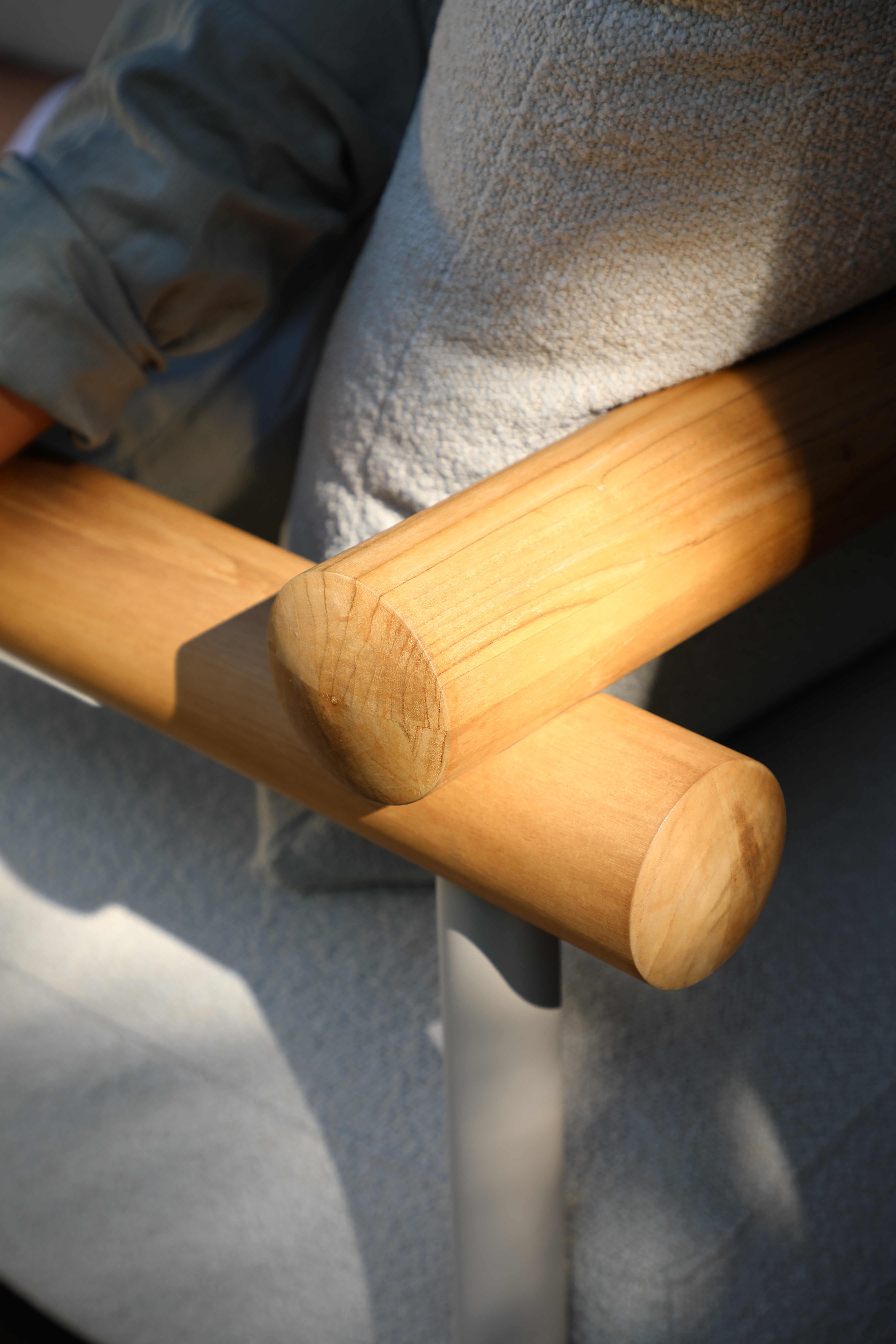Каркас выполнен из прочного и лёгкого алюминия в сочетании с натуральным тиковым деревом, что гарантирует долговечность и стойкость к погодным условиям. Подушки покрыты водоотталкивающей тканью Олефин с защитой от солнца – они сохранят яркость цвета и комфорт даже при длительном использовании.