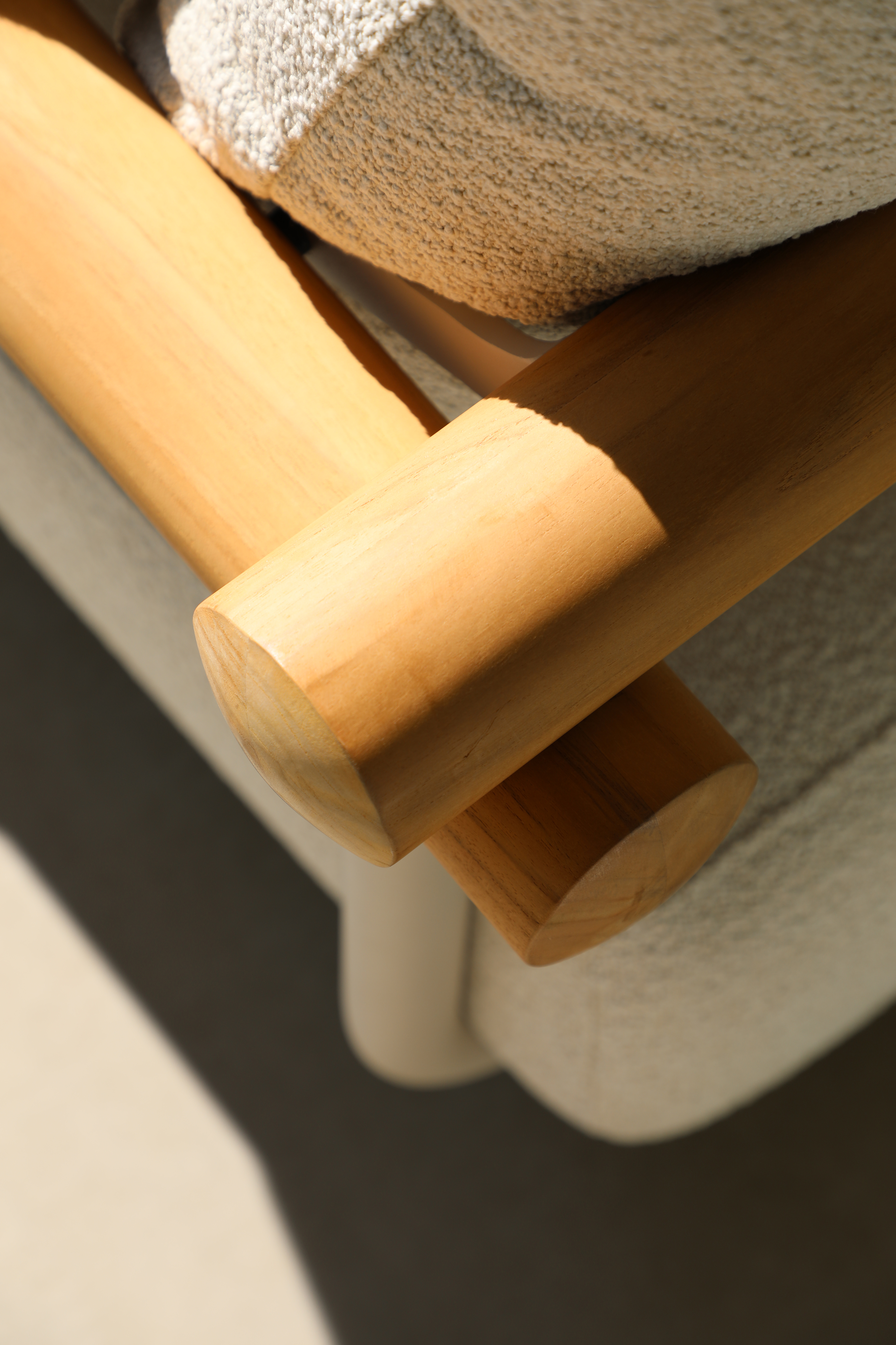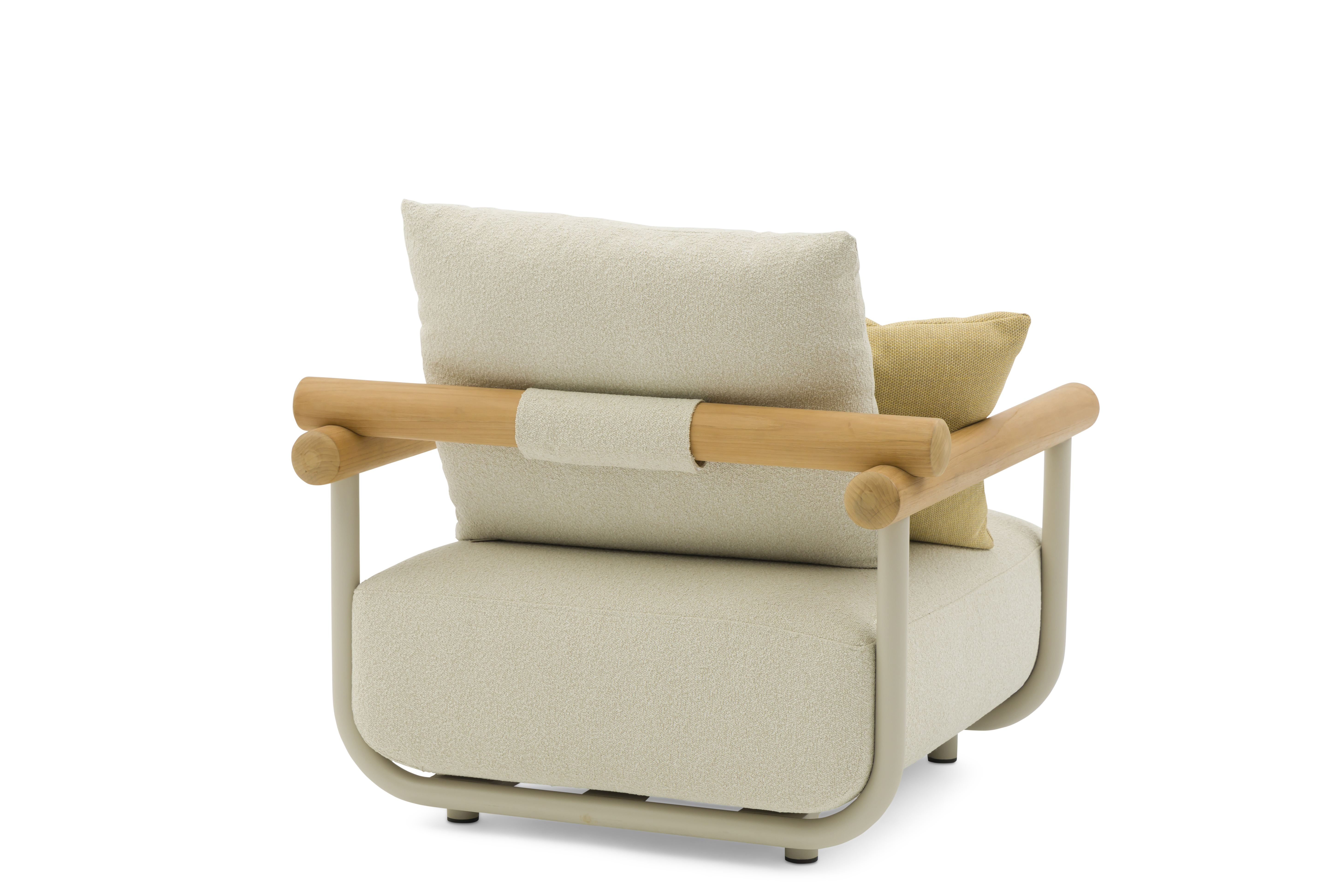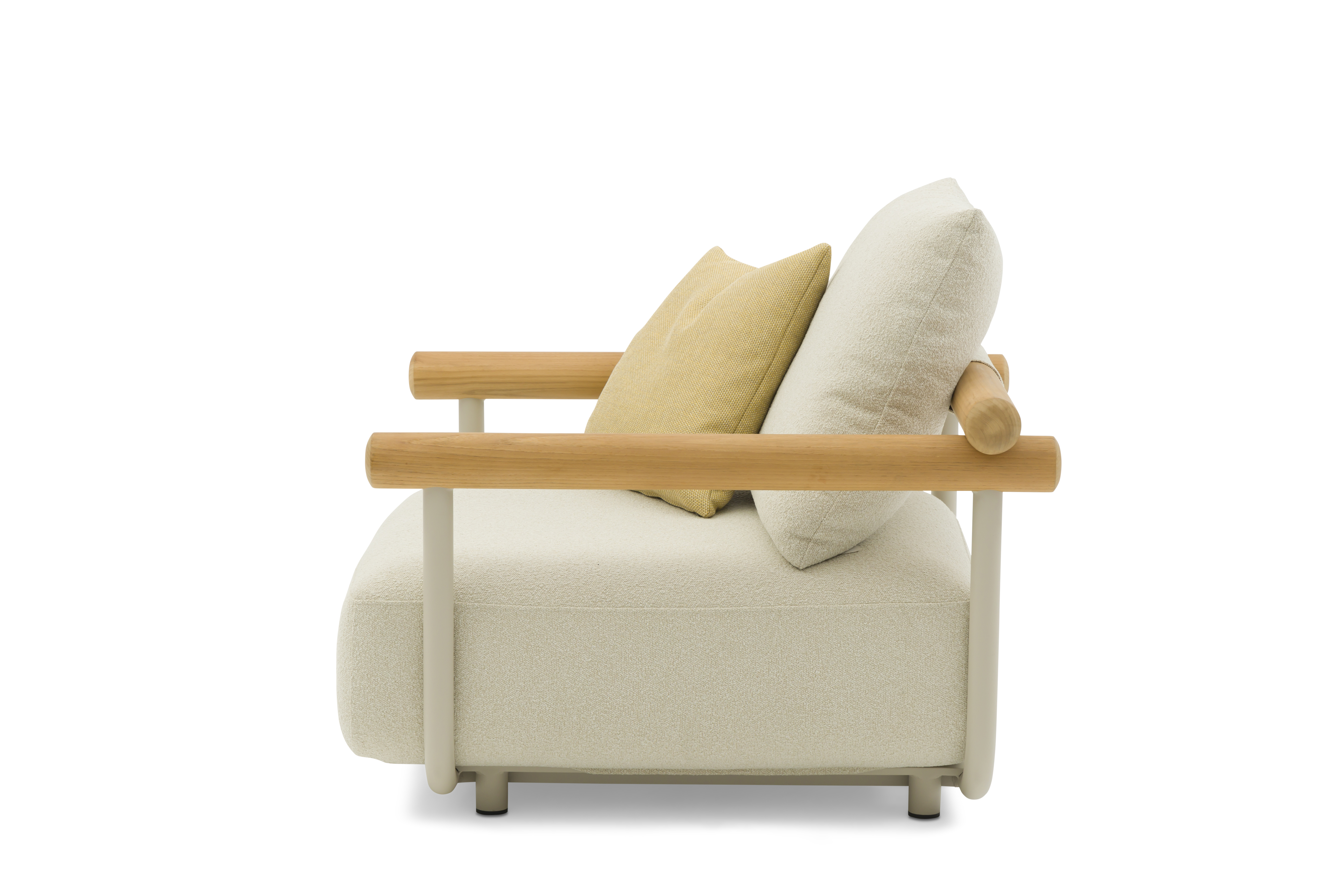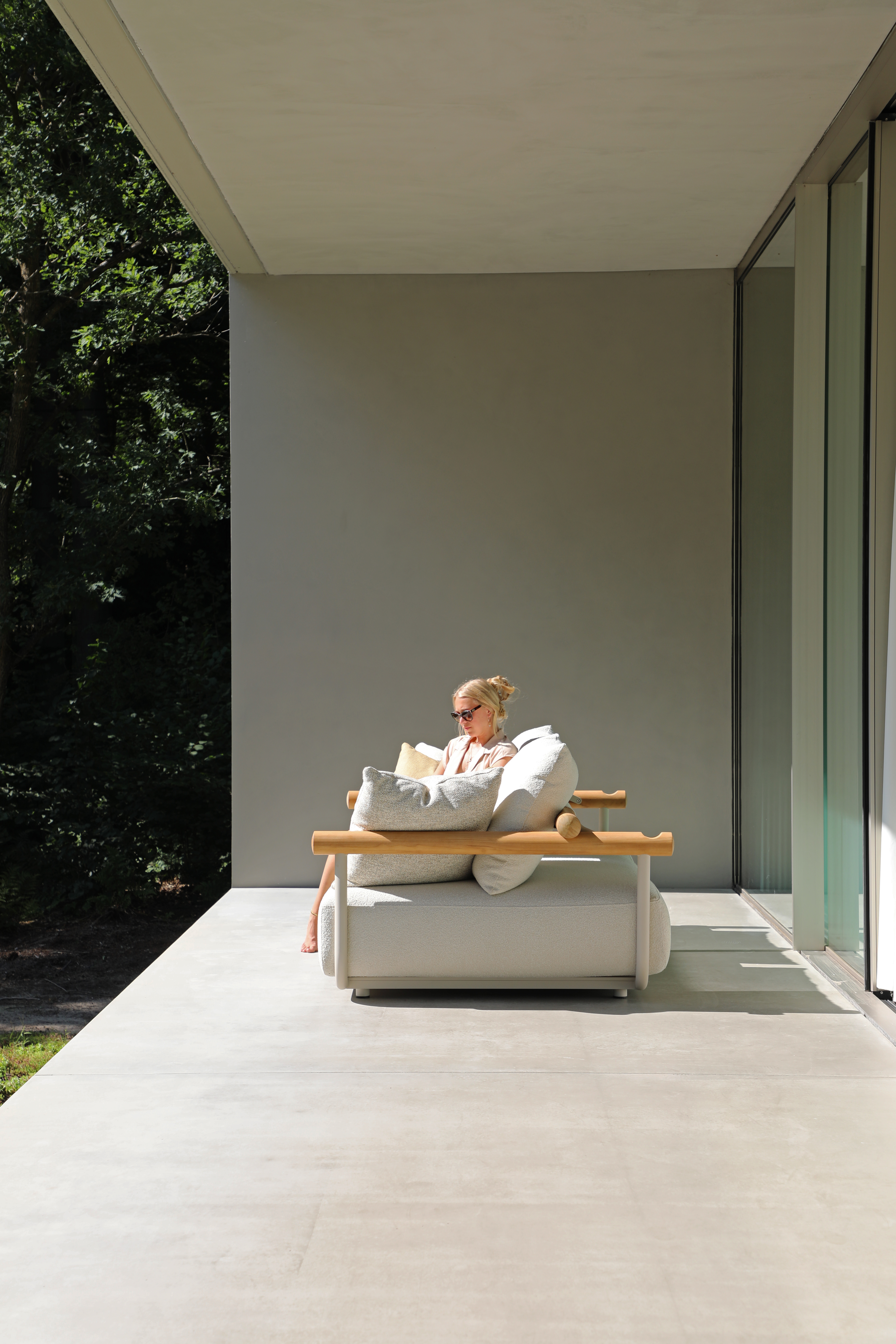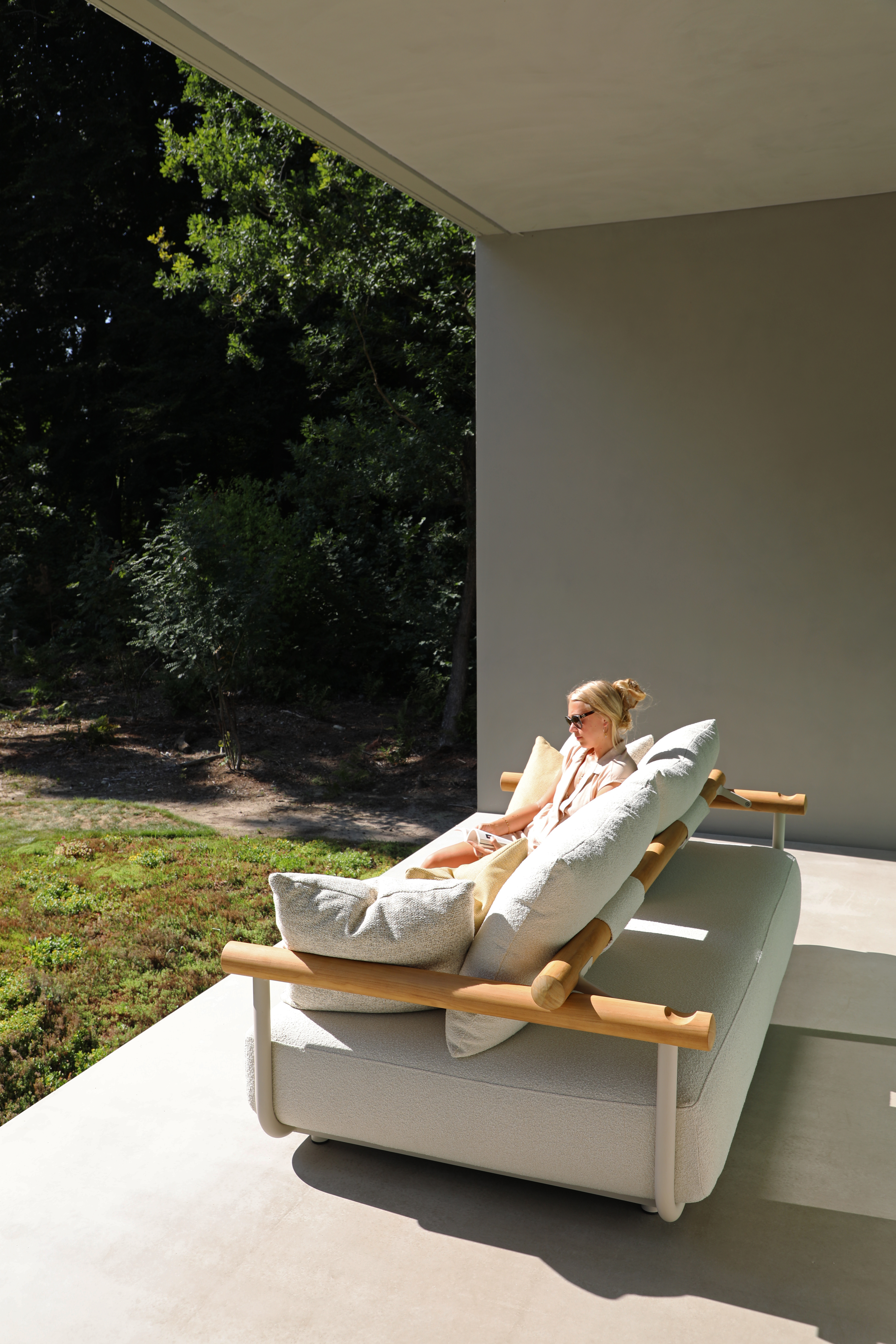 Каркас выполнен из прочного и лёгкого алюминия в сочетании с натуральным тиковым деревом, что гарантирует долговечность и стойкость к погодным условиям. Подушки покрыты водоотталкивающей тканью Олефин с защитой от солнца – они сохранят яркость цвета и комфорт даже при длительном использовании.