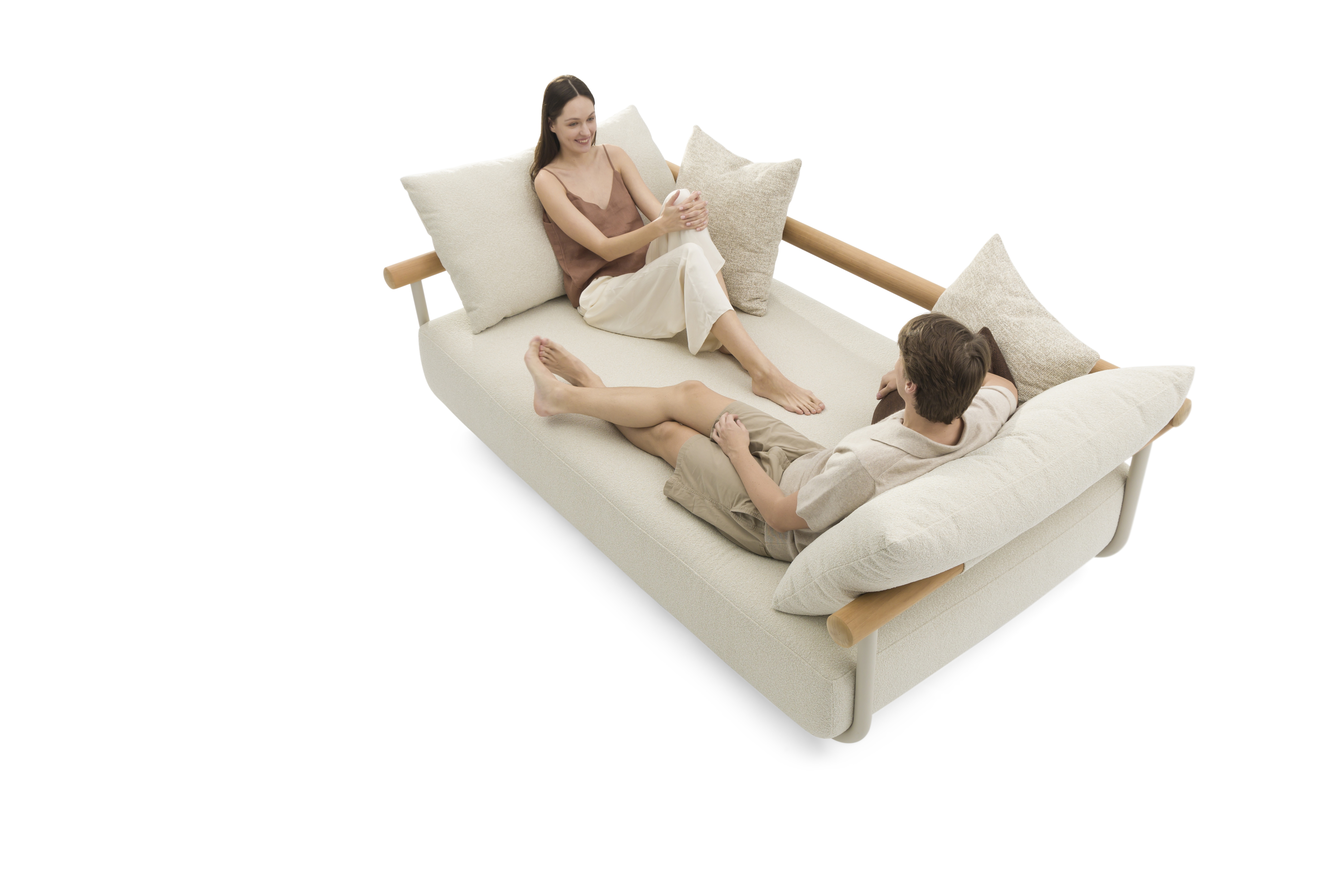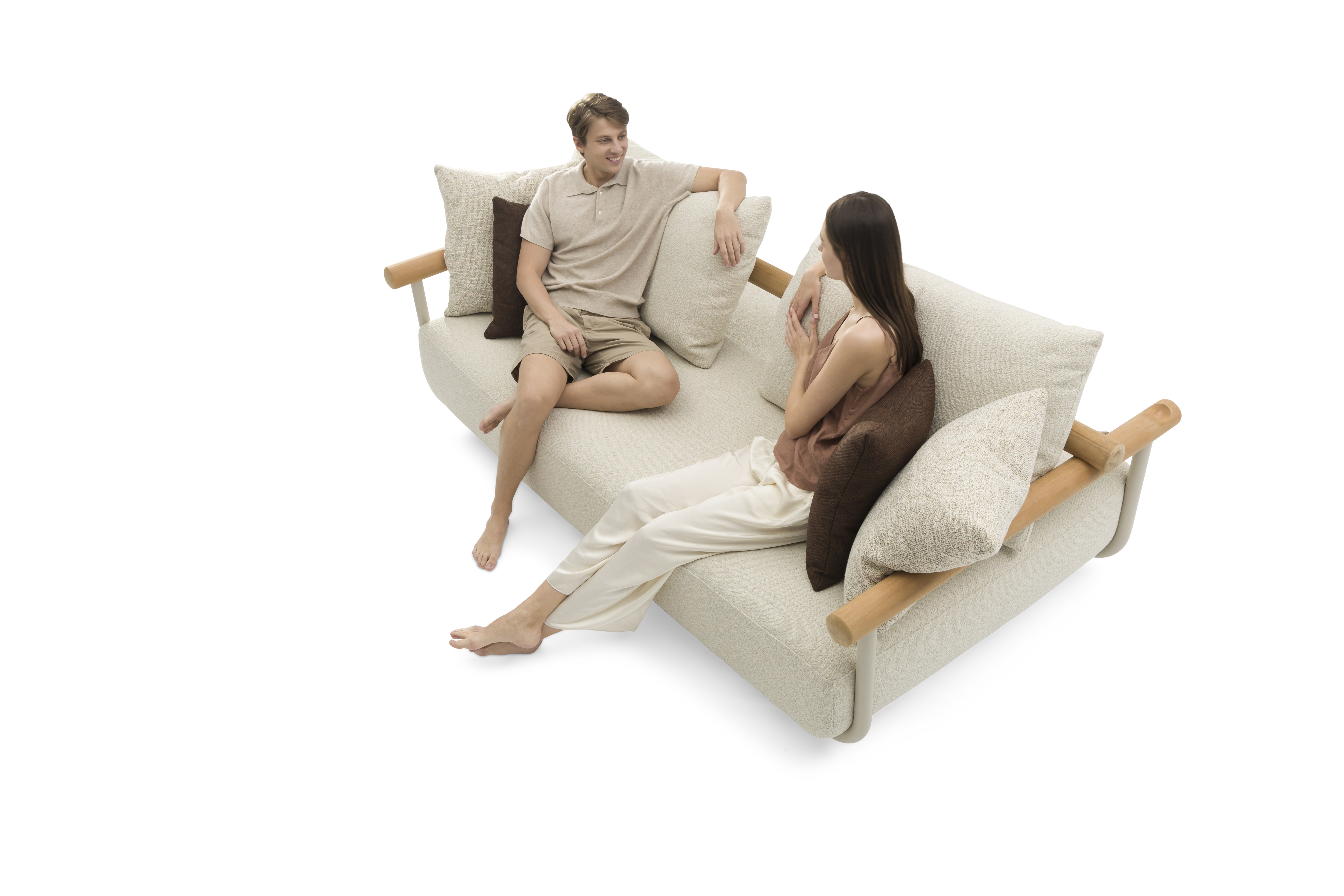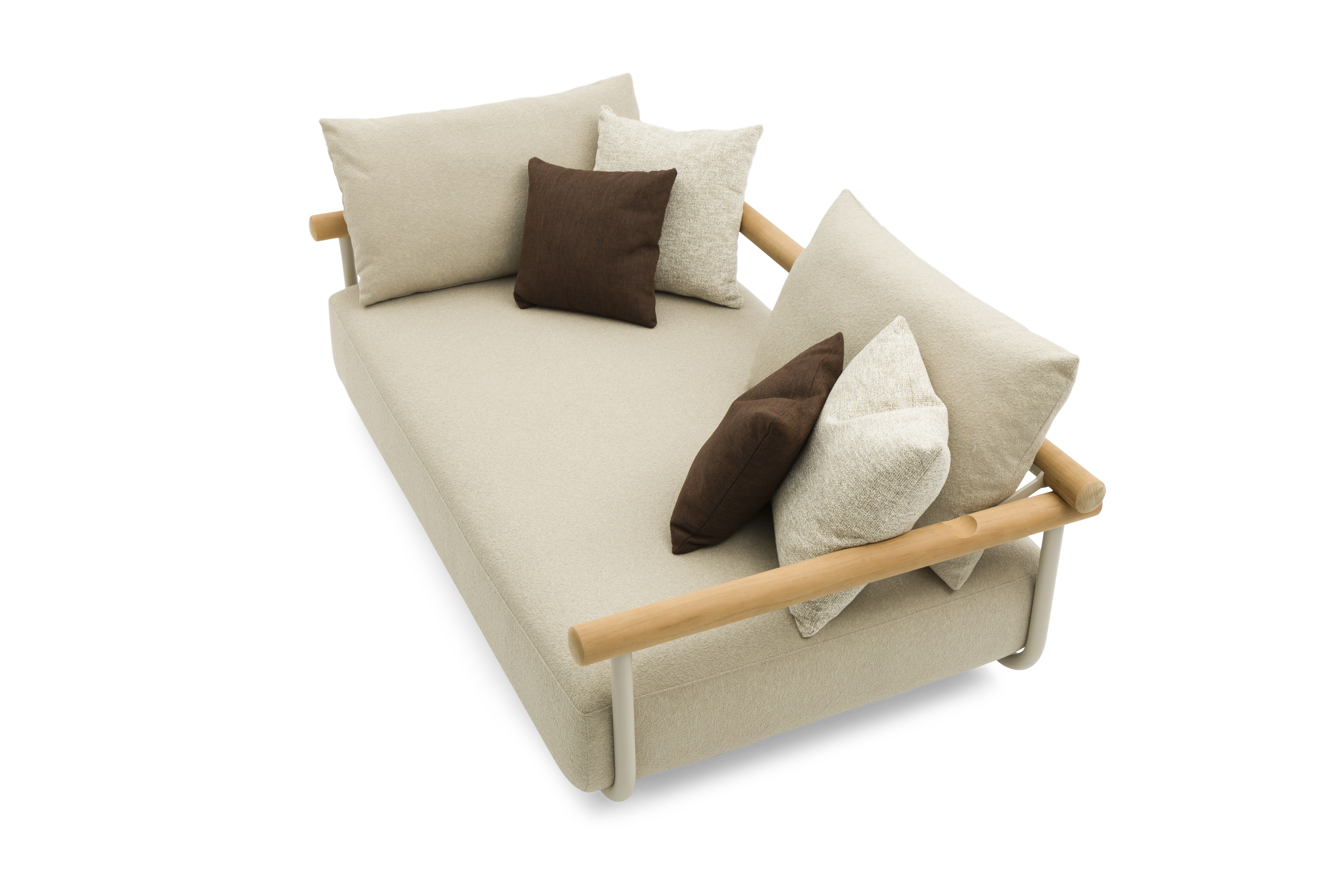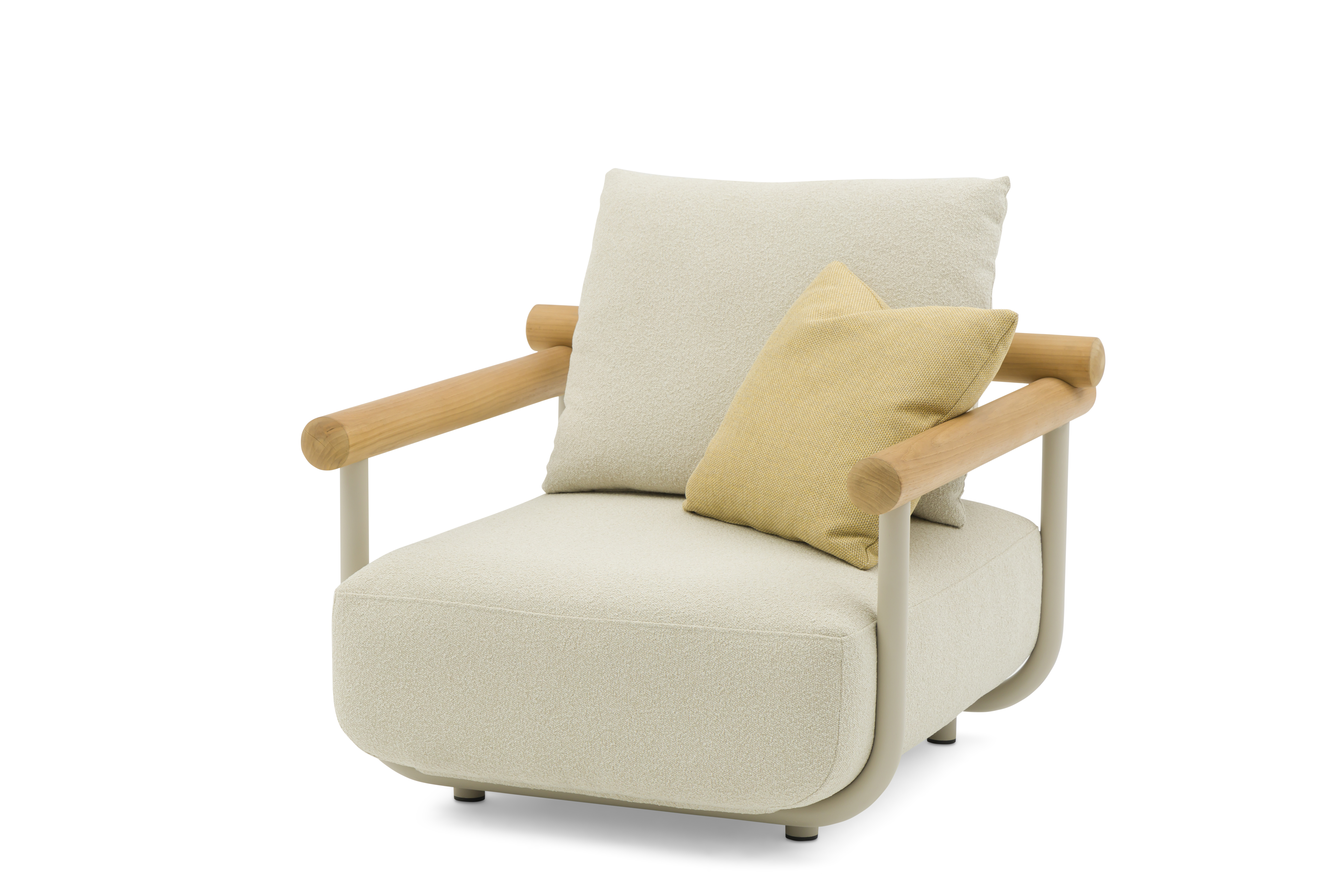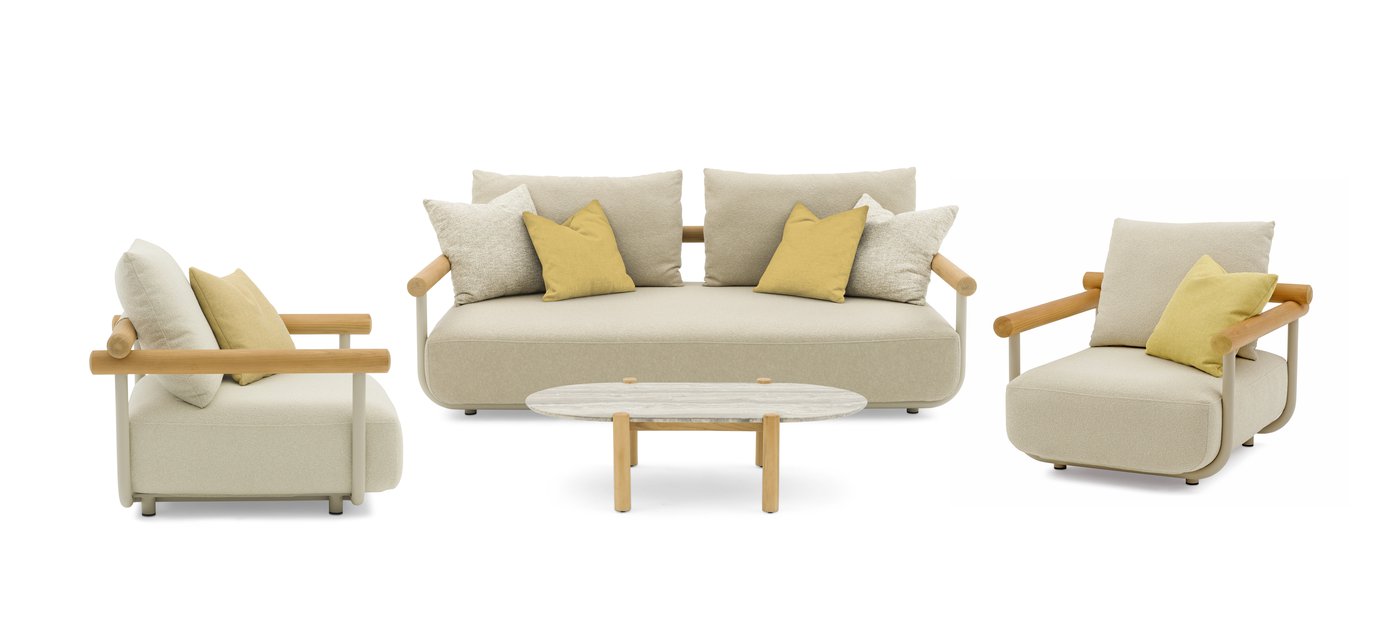 Каркас выполнен из прочного и лёгкого алюминия в сочетании с натуральным тиковым деревом, что гарантирует долговечность и стойкость к погодным условиям. Подушки покрыты водоотталкивающей тканью Олефин с защитой от солнца – они сохранят яркость цвета и комфорт даже при длительном использовании.