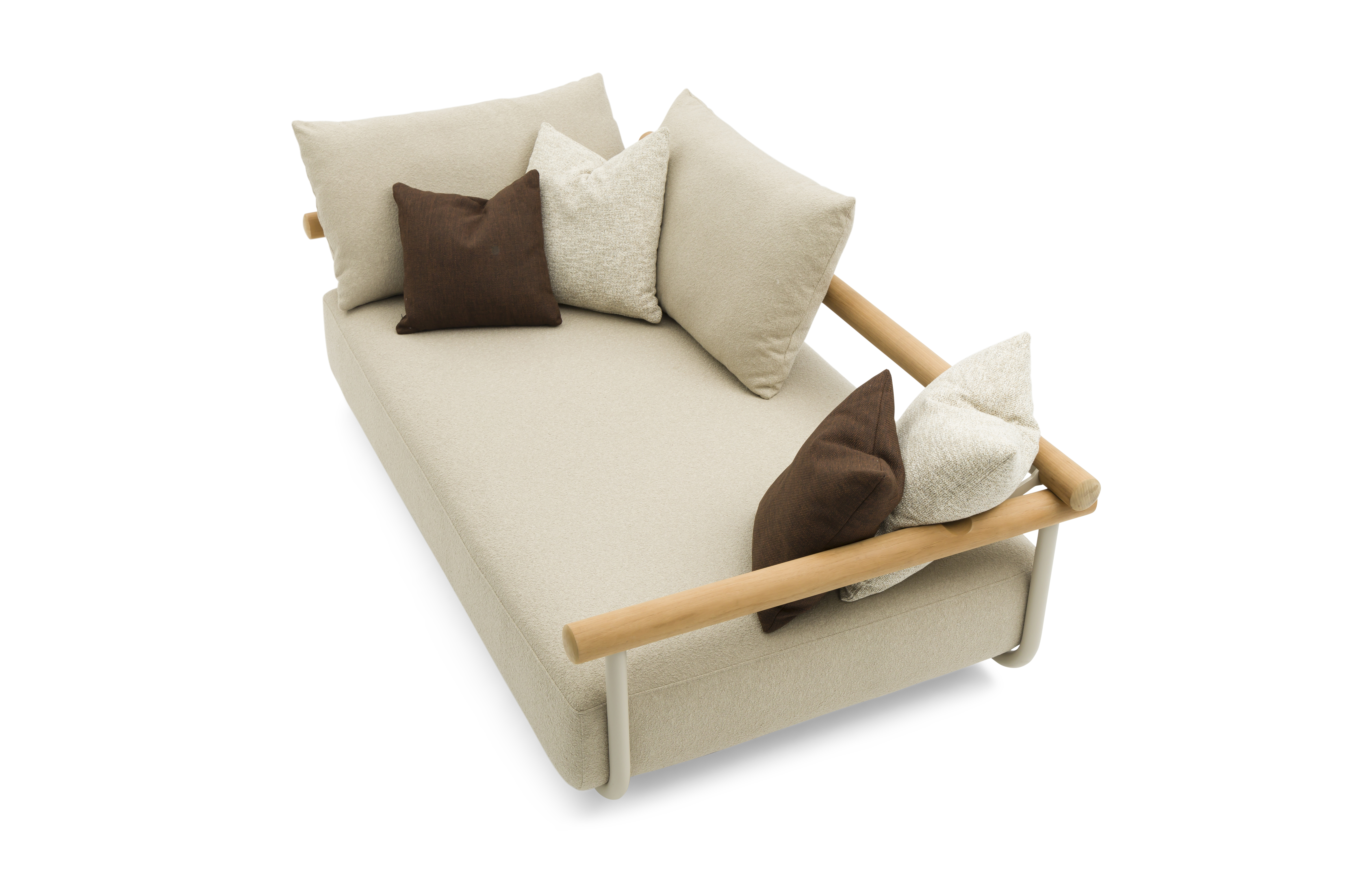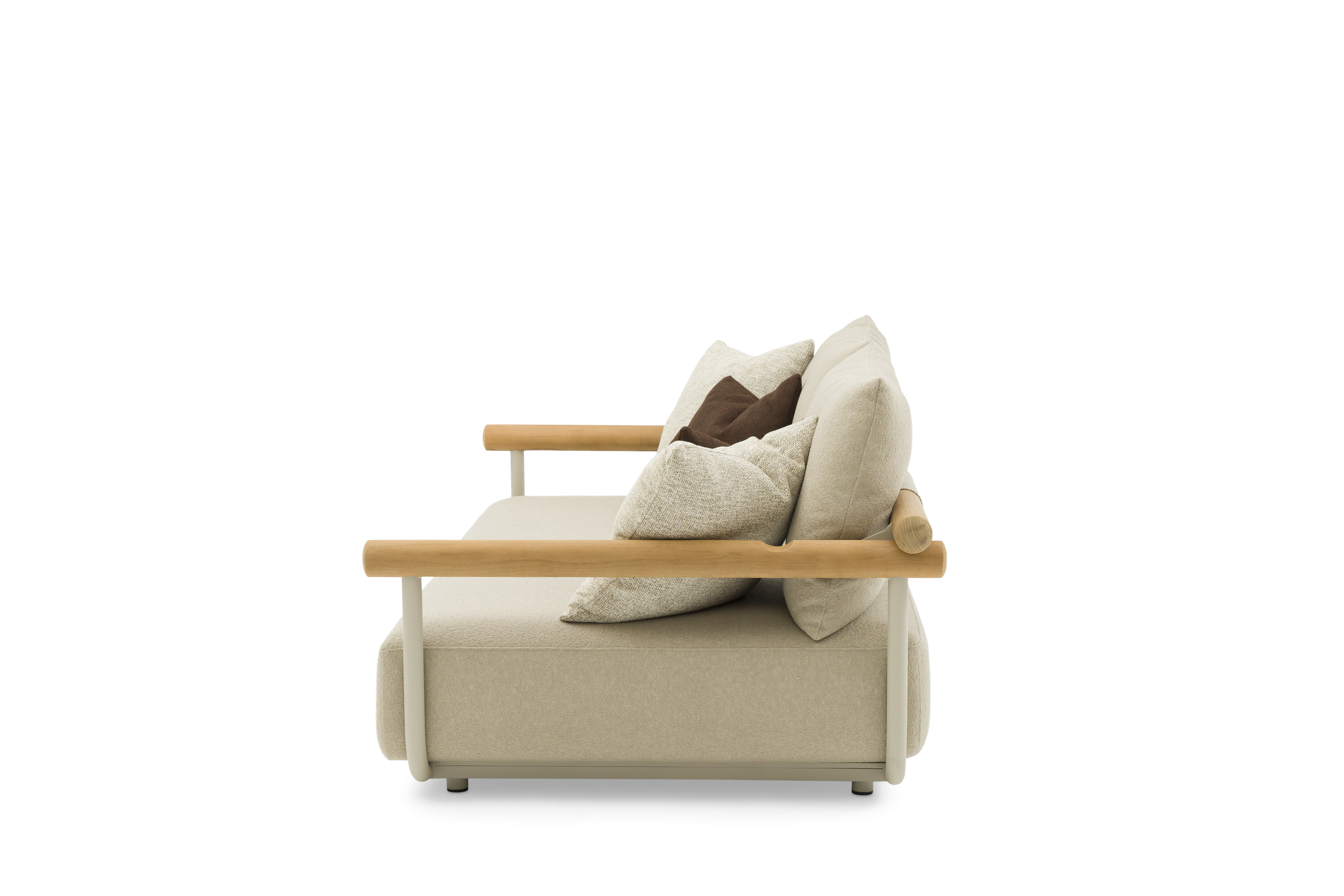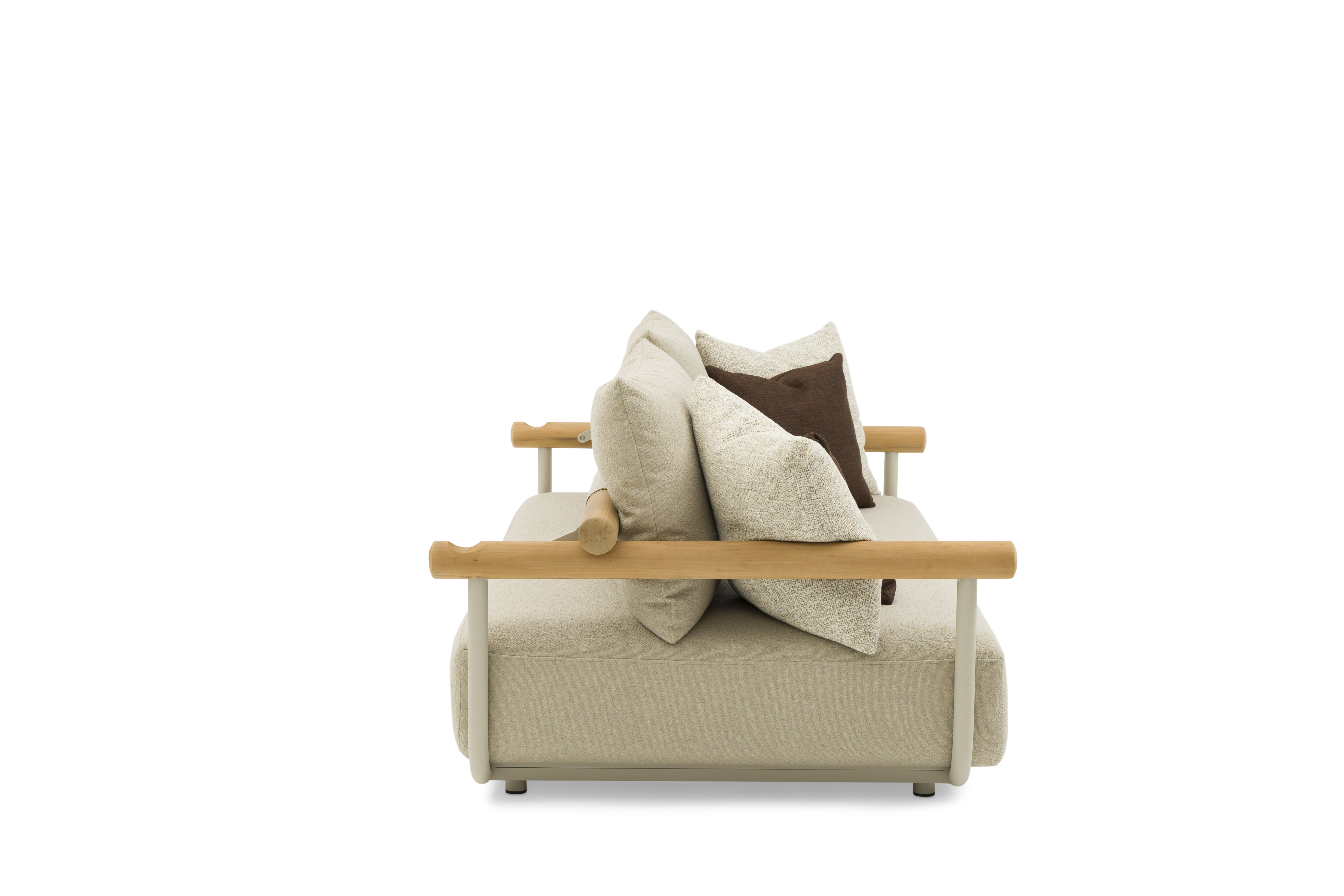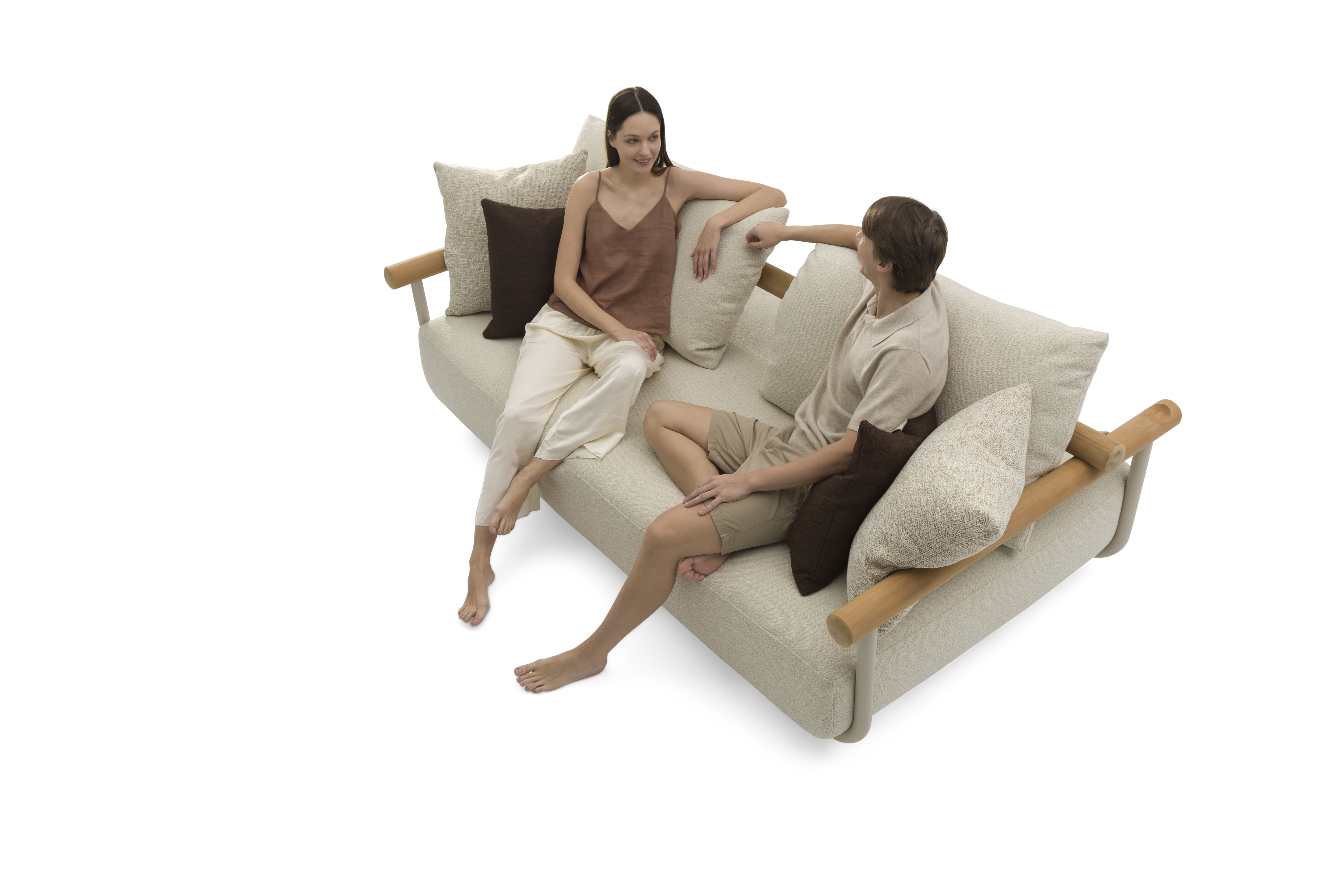 Каркас выполнен из прочного и лёгкого алюминия в сочетании с натуральным тиковым деревом, что гарантирует долговечность и стойкость к погодным условиям. Подушки покрыты водоотталкивающей тканью Олефин с защитой от солнца – они сохранят яркость цвета и комфорт даже при длительном использовании.