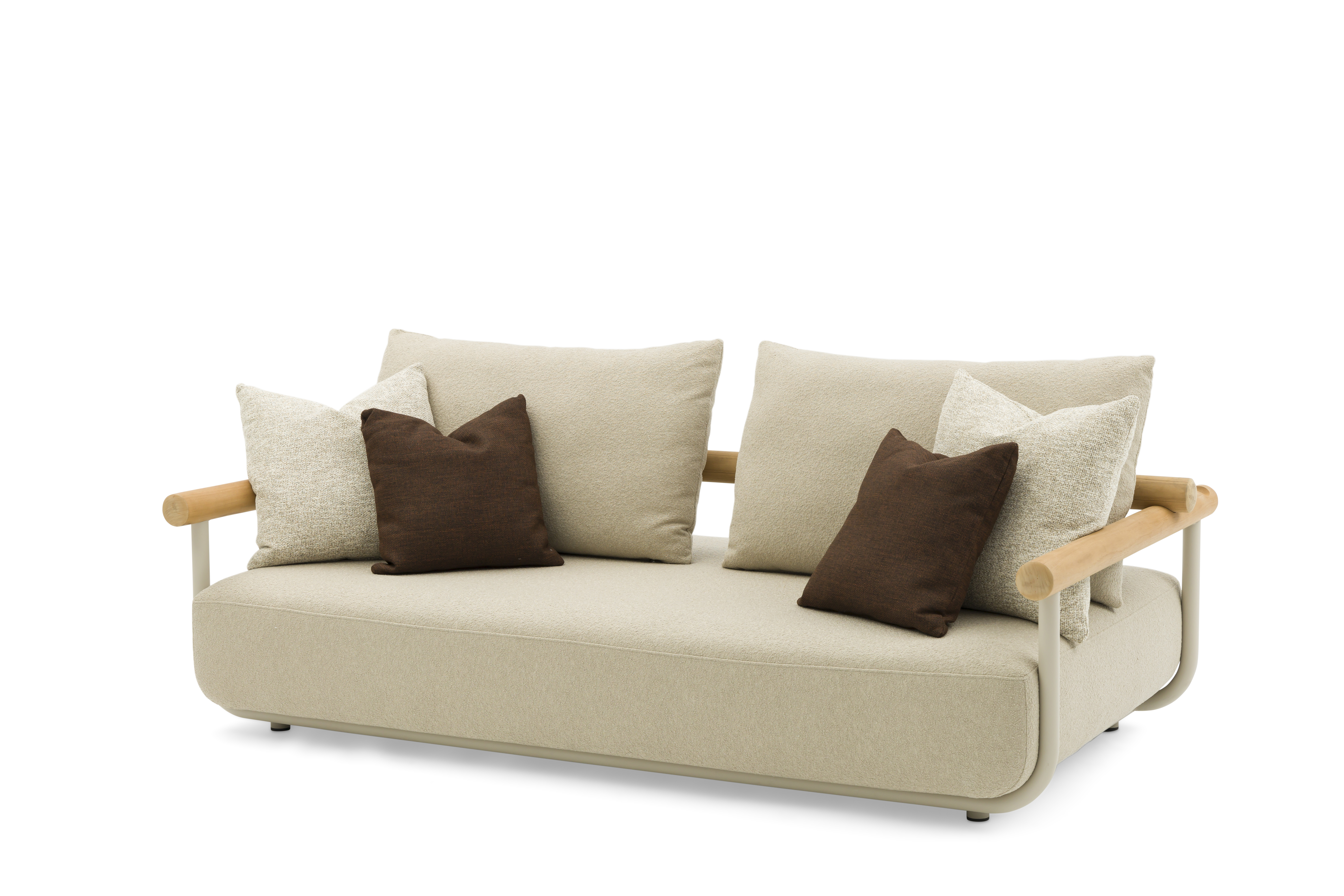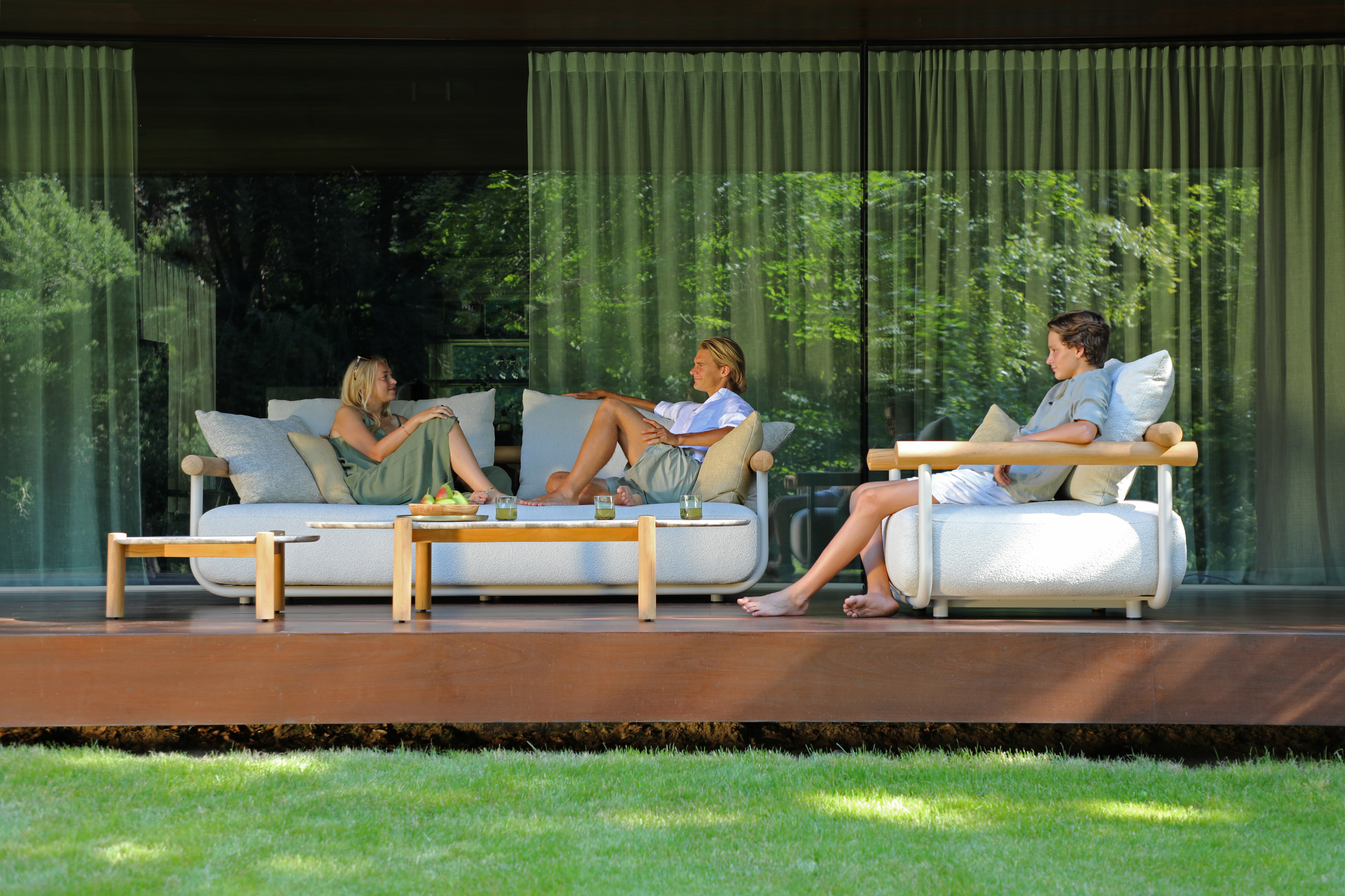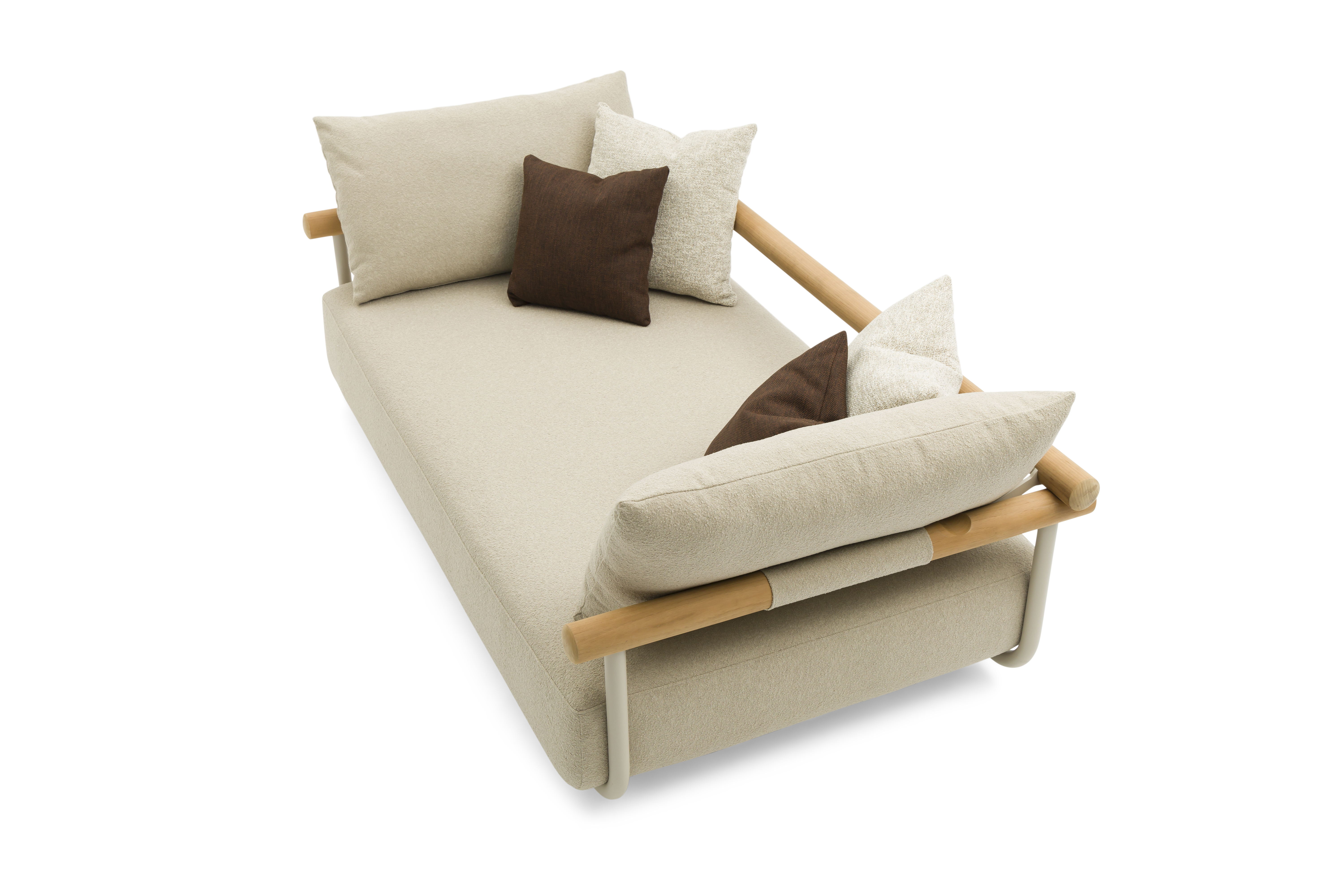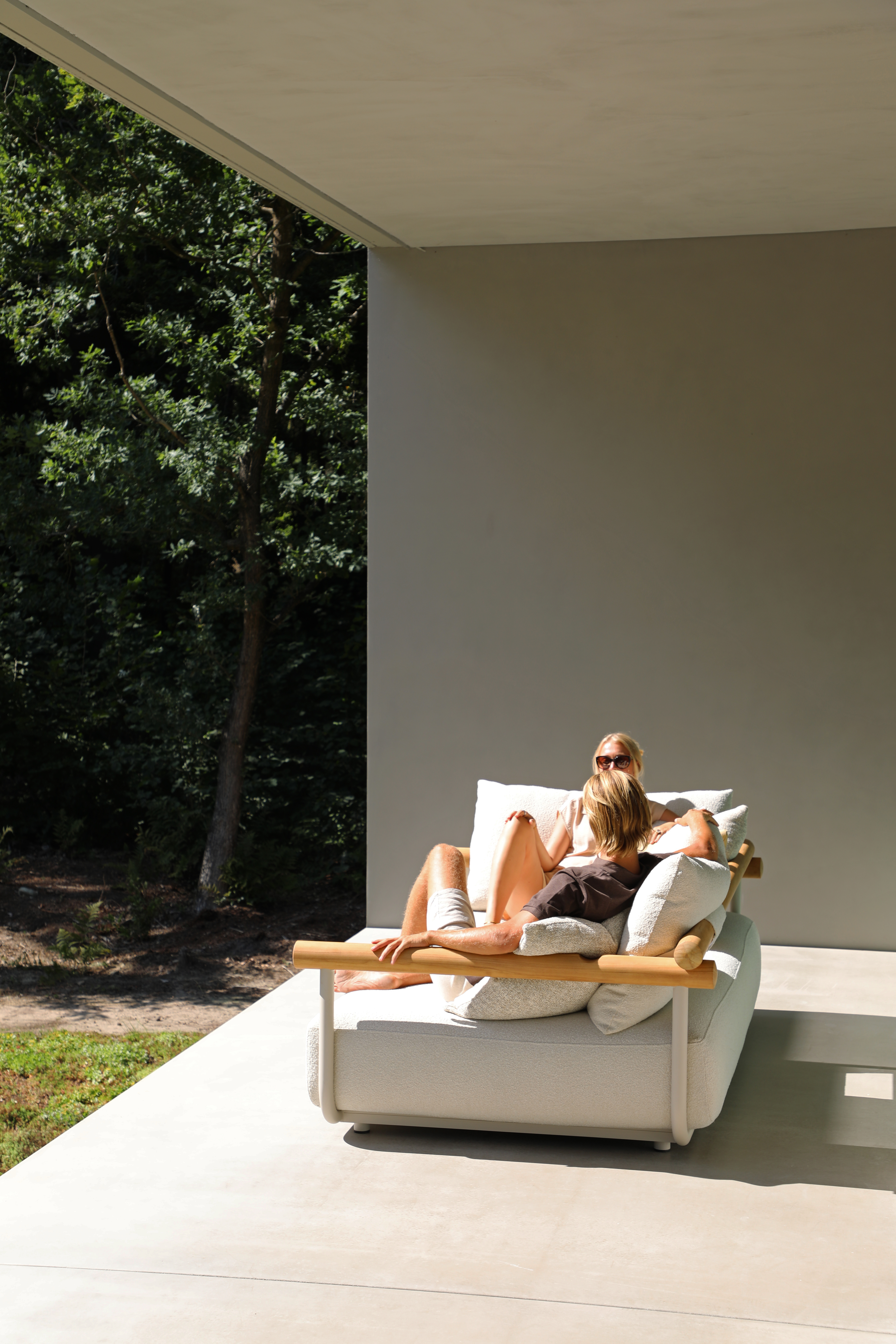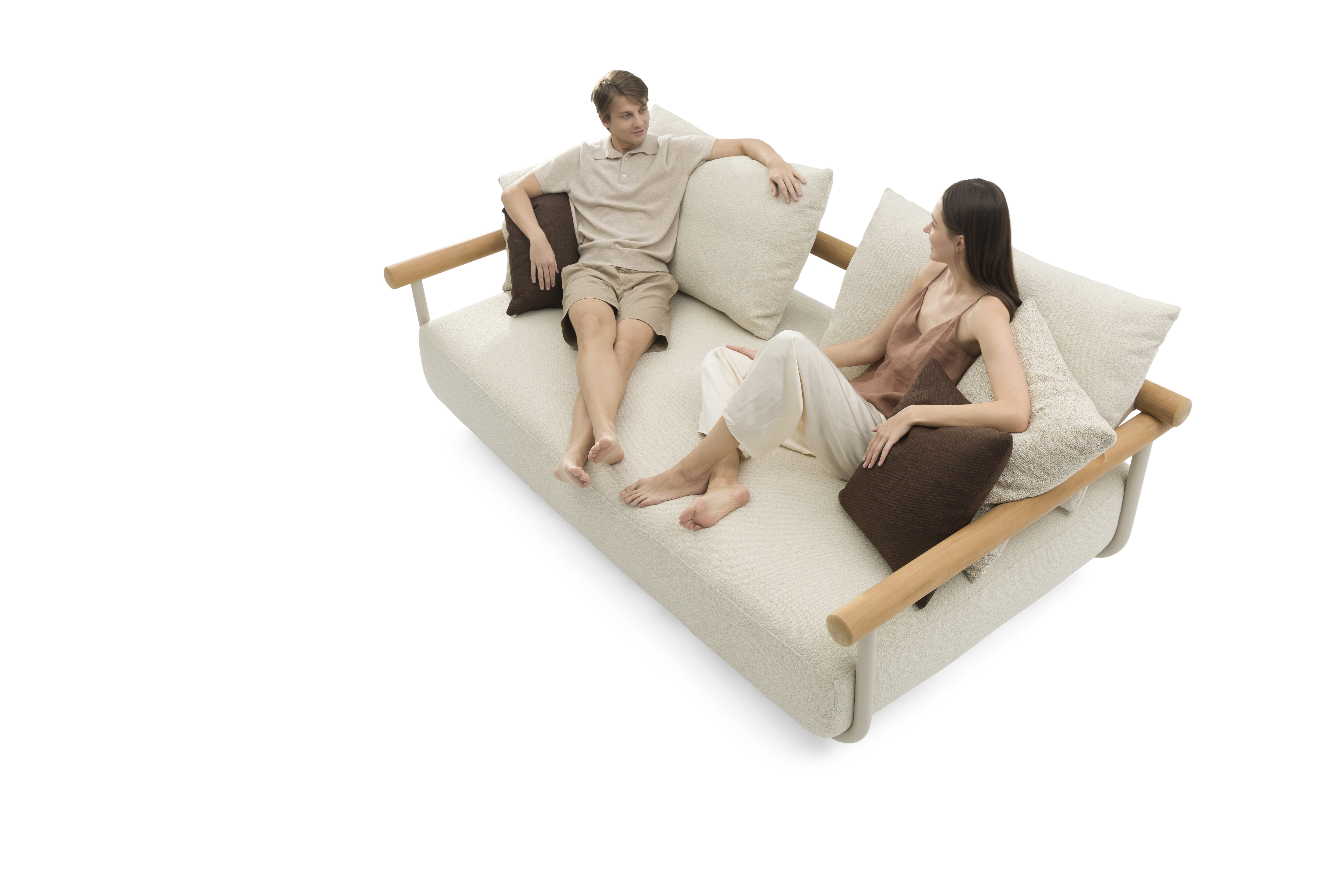 Каркас выполнен из прочного и лёгкого алюминия в сочетании с натуральным тиковым деревом, что гарантирует долговечность и стойкость к погодным условиям. Подушки покрыты водоотталкивающей тканью Олефин с защитой от солнца – они сохранят яркость цвета и комфорт даже при длительном использовании.