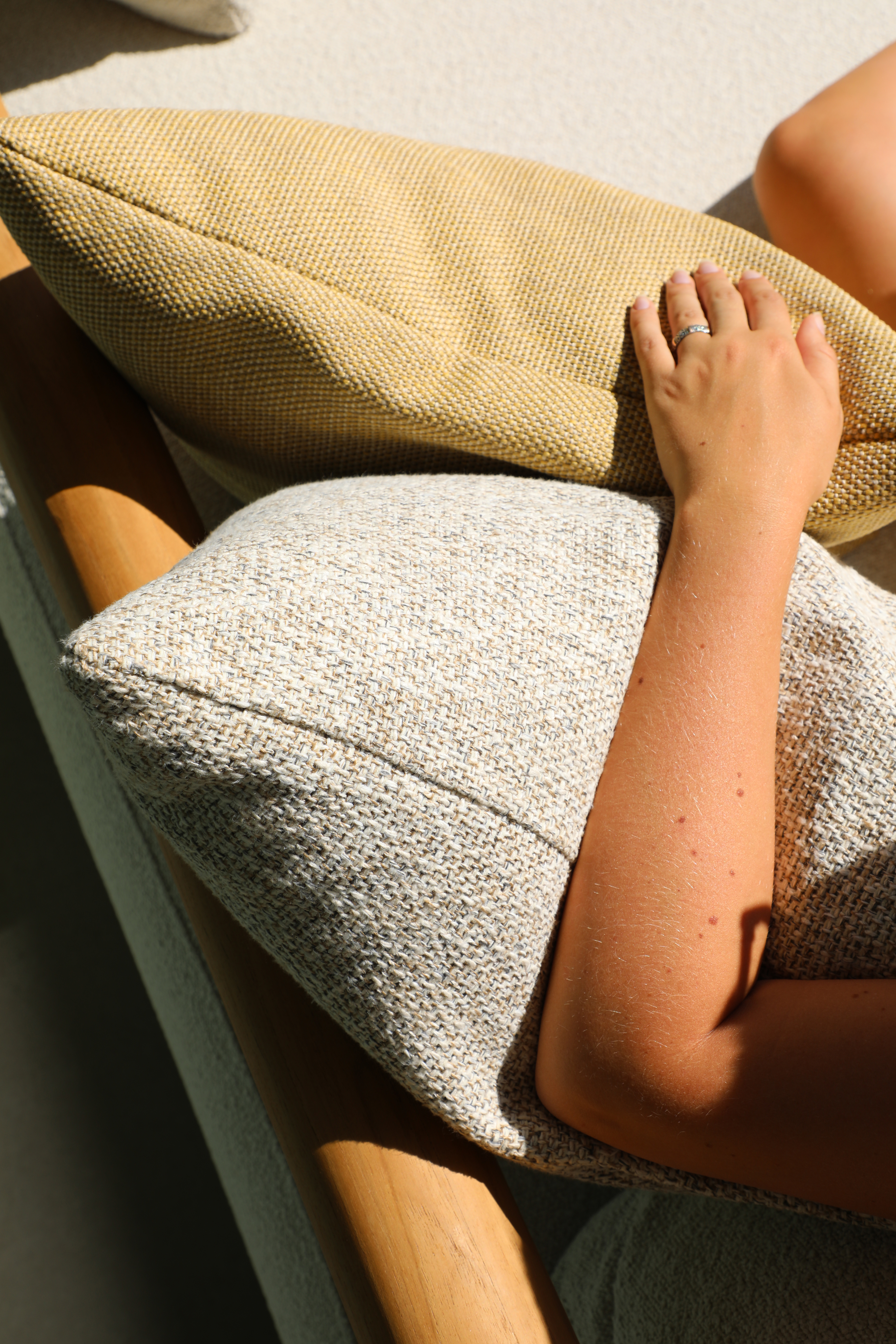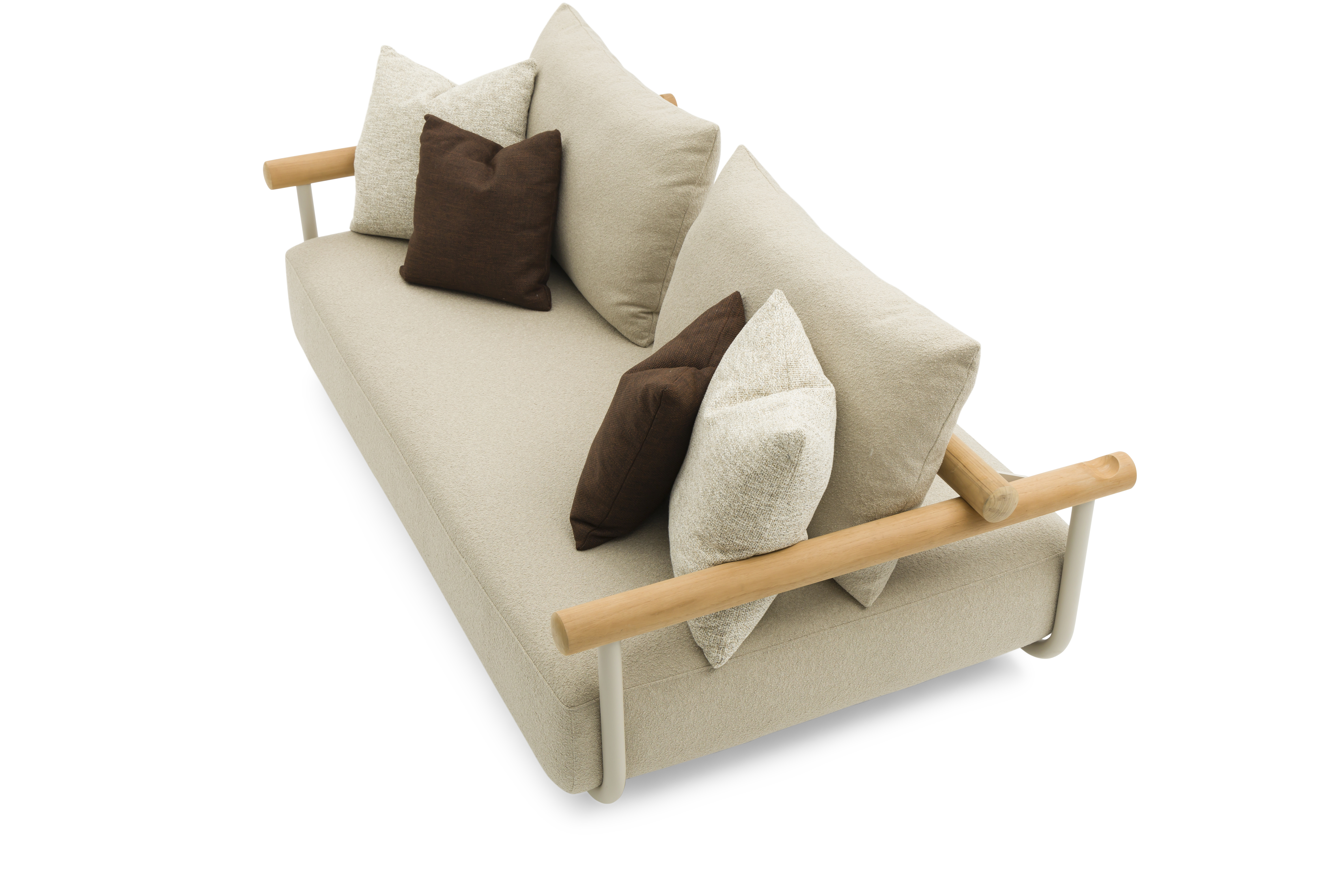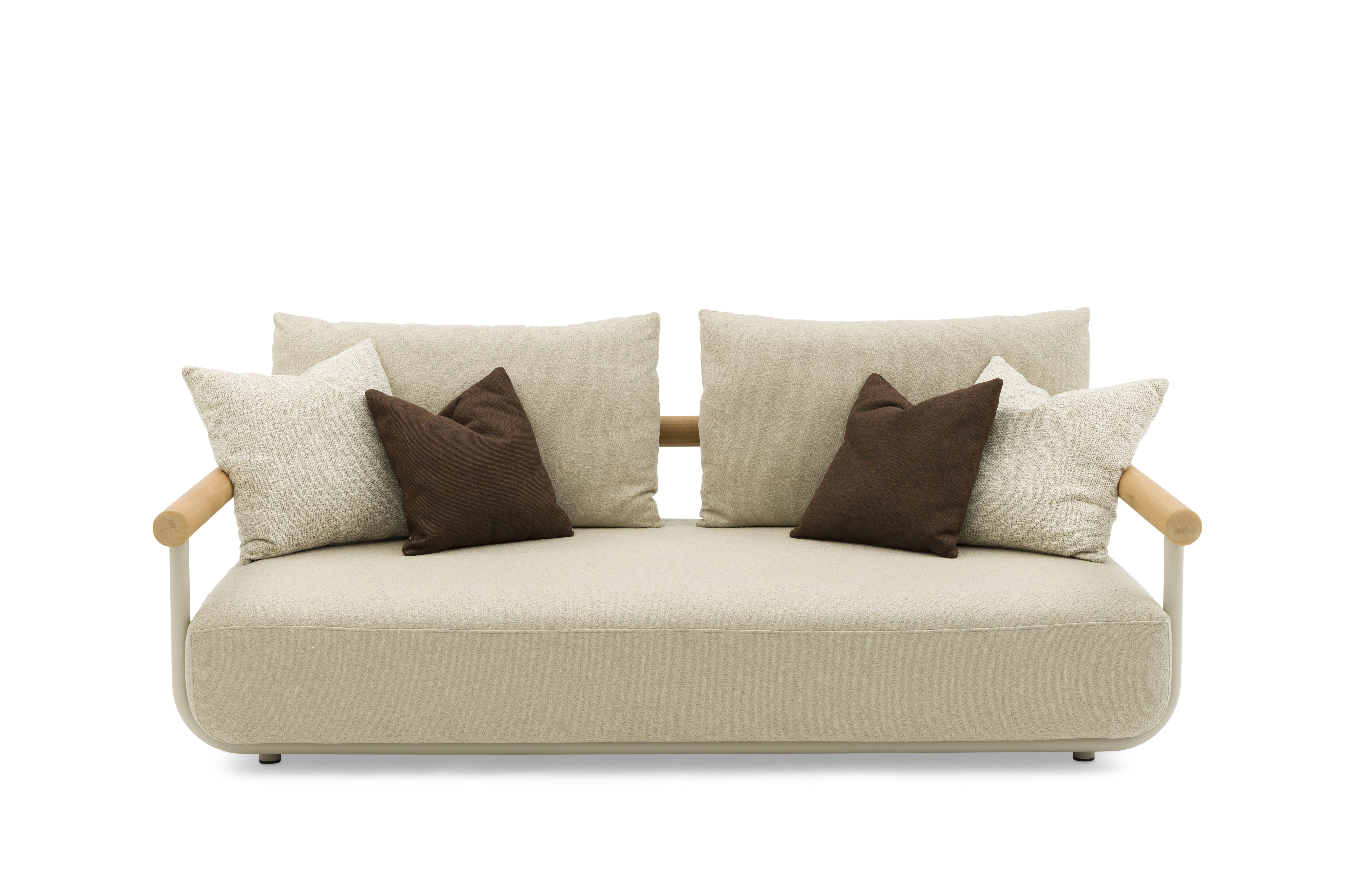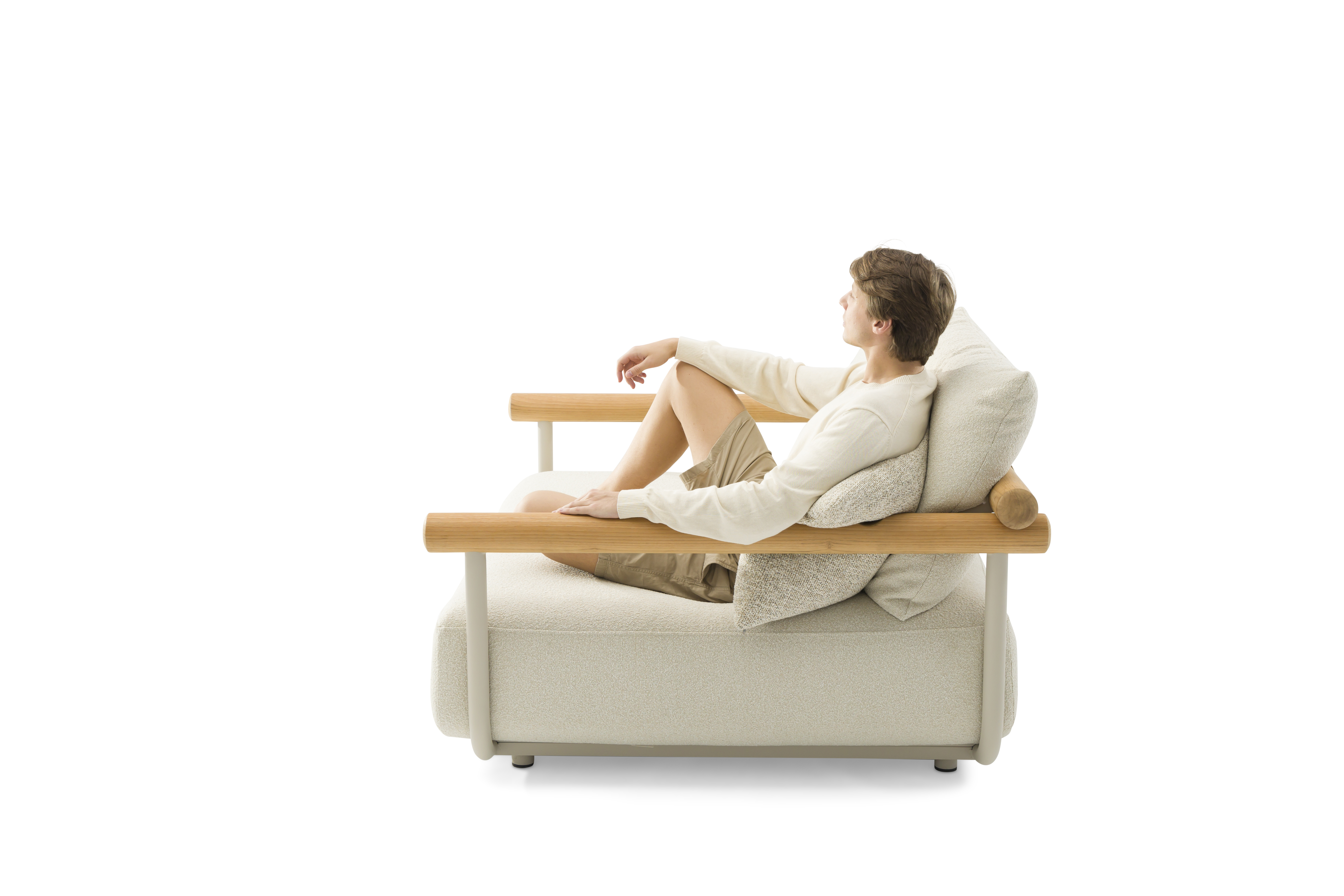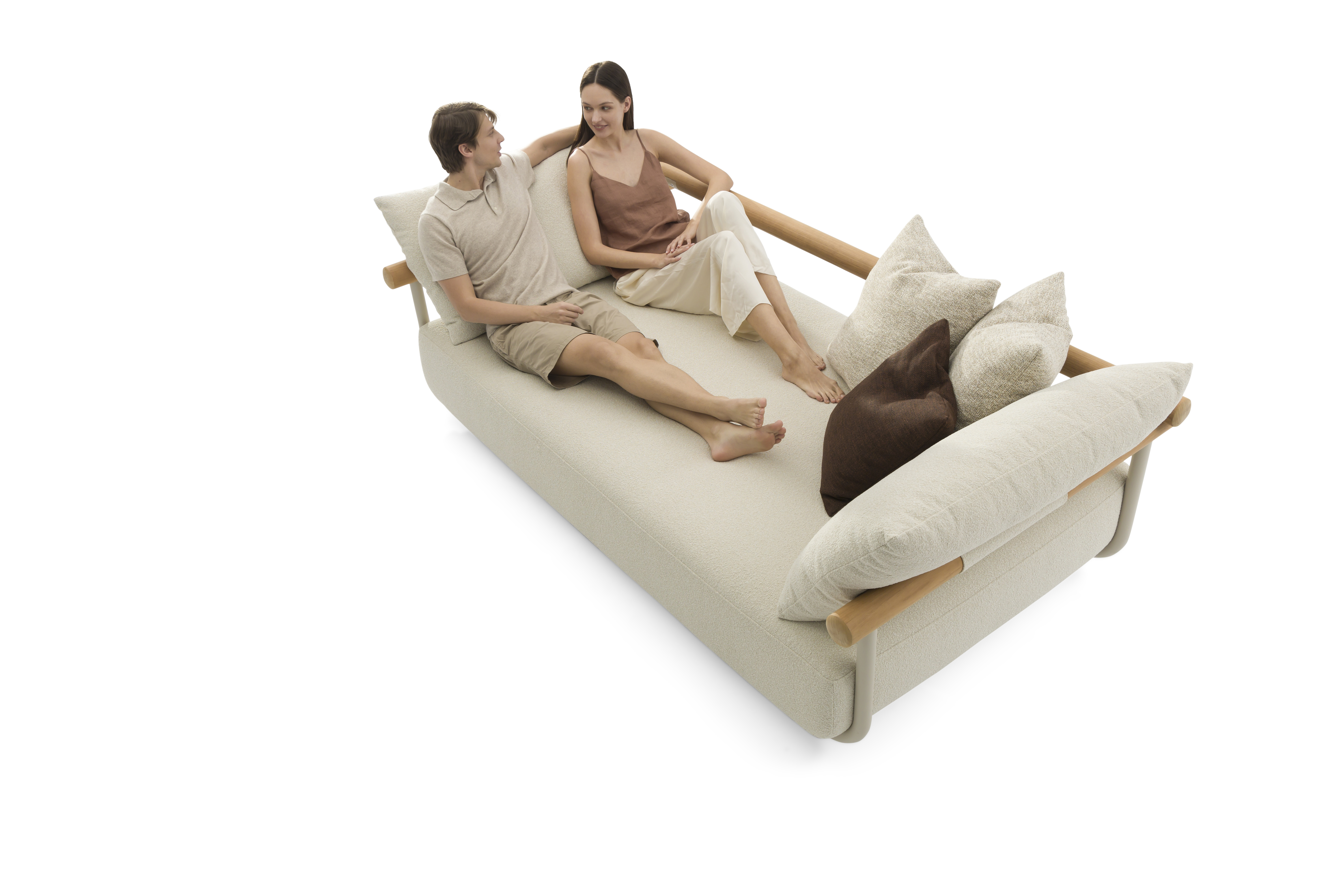 Каркас выполнен из прочного и лёгкого алюминия в сочетании с натуральным тиковым деревом, что гарантирует долговечность и стойкость к погодным условиям. Подушки покрыты водоотталкивающей тканью Олефин с защитой от солнца – они сохранят яркость цвета и комфорт даже при длительном использовании.
