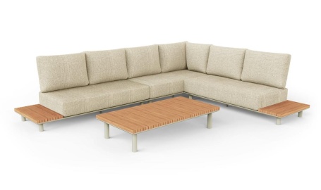 Высота от пола до края подушки составляет 38 см, что обеспечивает удобный доступ к мебели, а толщина тиковых элементов составляет 3,5 см, что придаёт столешницам дополнительную прочность и элегантность.