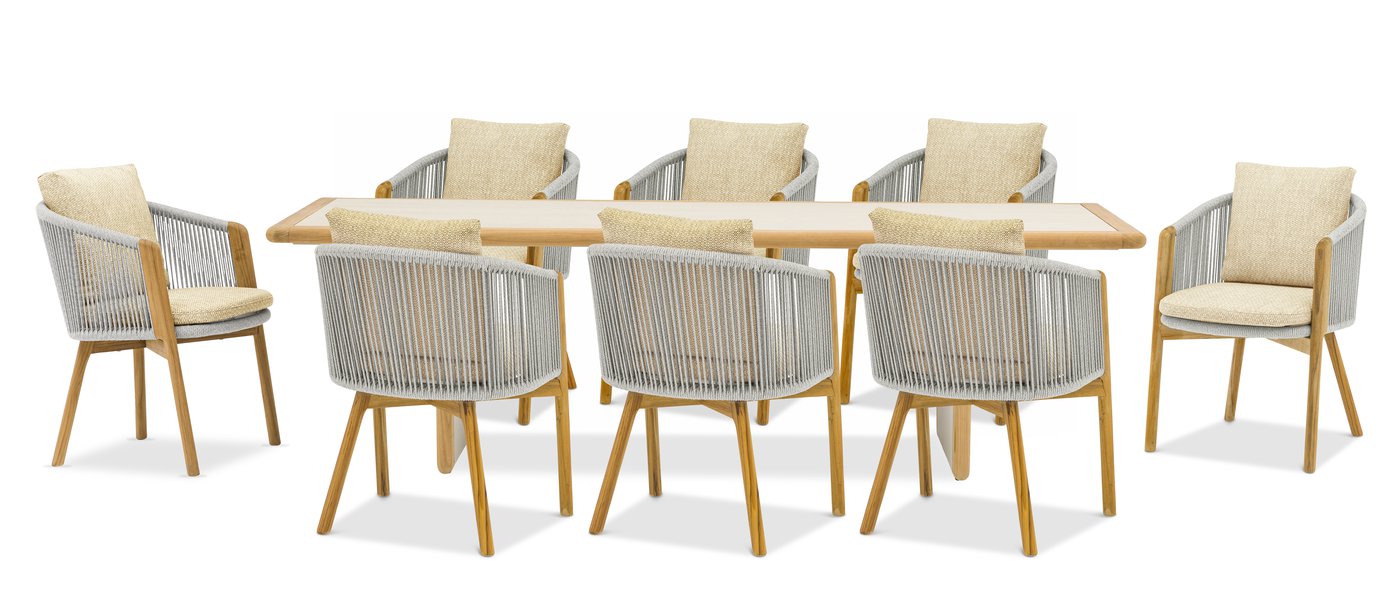 Обеденная группа включает в себя стол и кресла. Стол имеет керамическую столешницу толщиной 6 мм с краями из цельного тика. Размеры стола: длина — 273 см, ширина — 100 см, высота — 75 см. Это позволяет комфортно разместить до 8 человек.