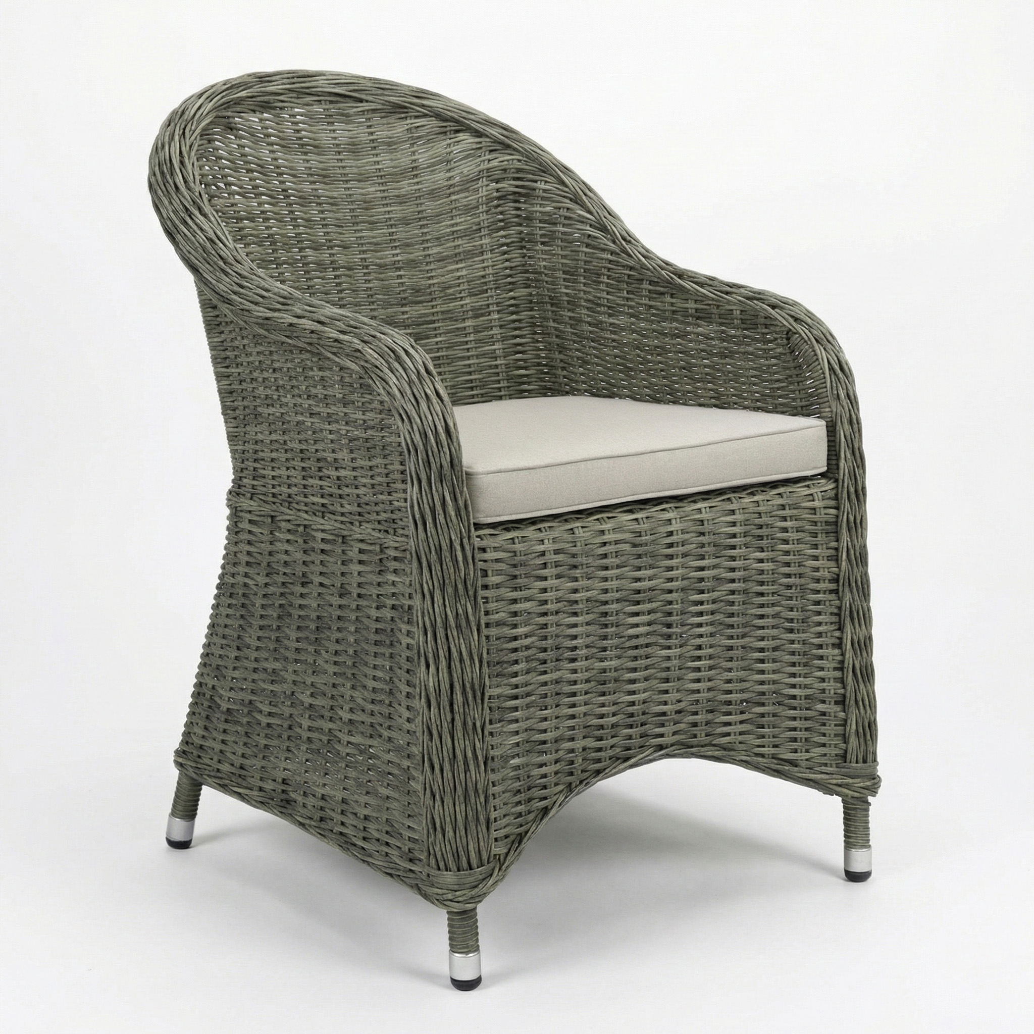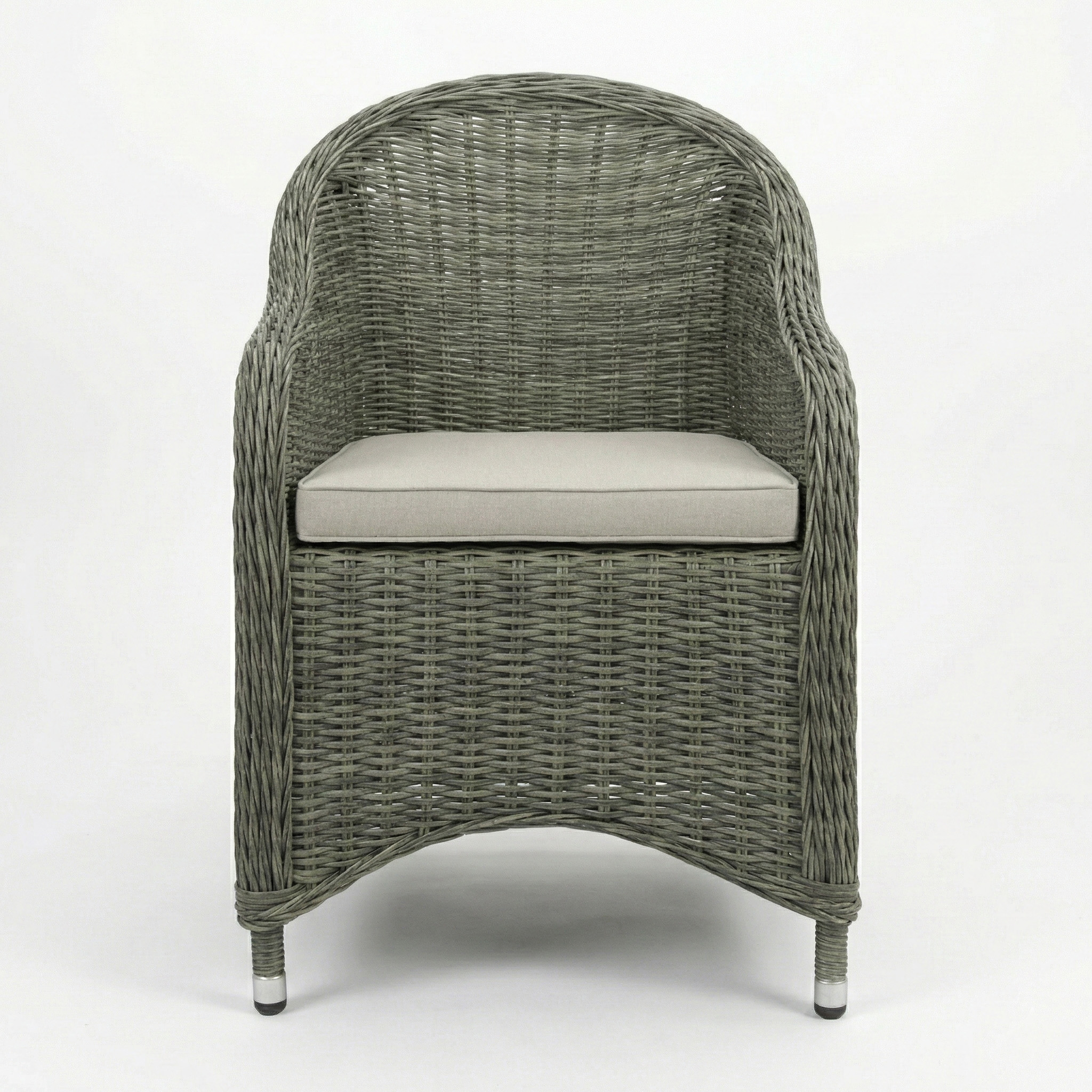 Кресло Лагуна (Lagoon) создаёт ощущение продуманного уюта и визуальной лёгкости, органично вписываясь как в современный интерьер, так и в атмосферу террасы или сада.Плетение выполнено из серого искусственного ротанга с тонкими коричневыми и бежевыми вкраплениями, за счёт чего оттенок мебели меняется в зависимости от освещения: от более прохладного пепельно‑серого до тёплого серо‑коричневого. Основа кресла построена на прочном и легком алюминиевом каркасе, который обеспечивает надёжность и устойчивость конструкции, при этом сохраняет небольшой вес, поэтому предмет легко переставлять с места на место.